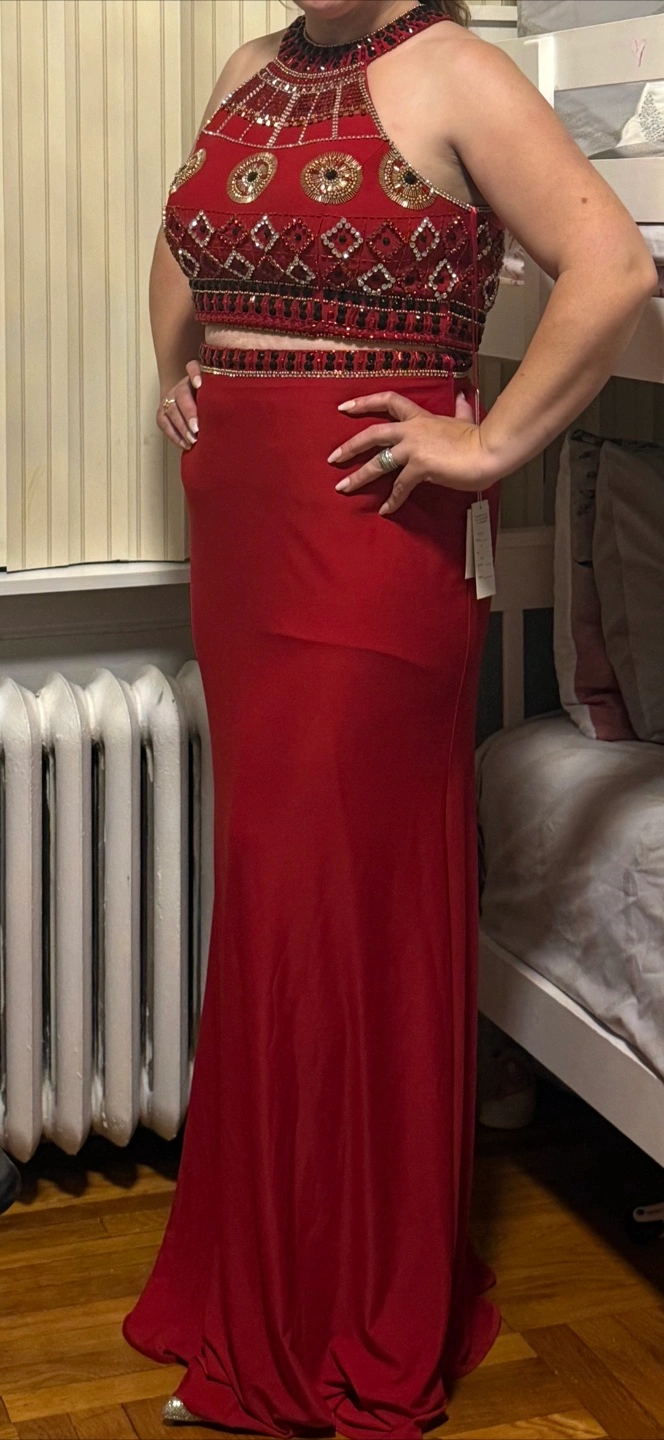 Beautiful red halter-style prom dress with intricate embellishments on the bodice. It's a stunning piece that's sure to turn heads!