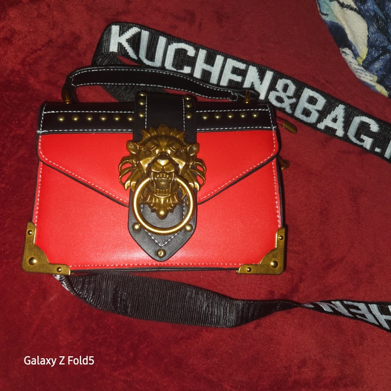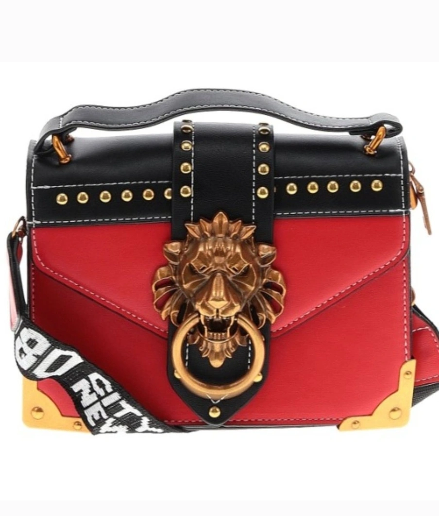 This is a stylish Kuchen&Bag.1980 purse with a unique design. It features a striking red and black color combination, adorned with a distinctive lion head detail. The purse has a structured shape and a shoulder strap with the brand name. Perfect for adding a bold statement to your outfit! **Zipper broken as shown in picture**