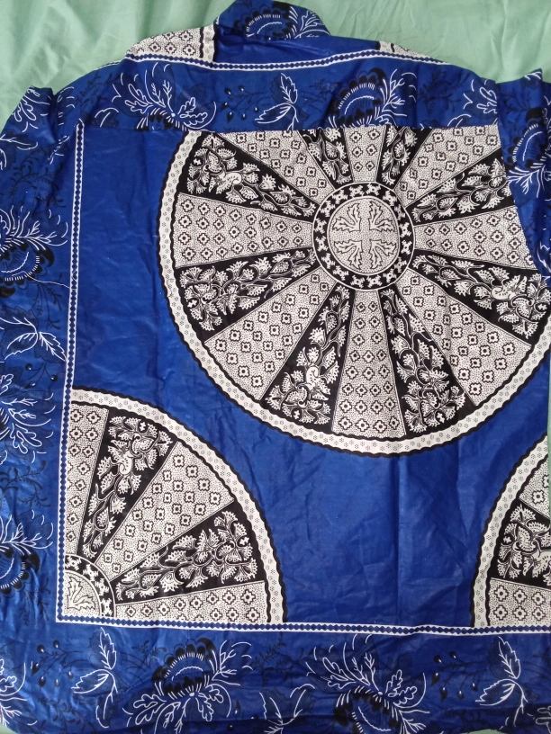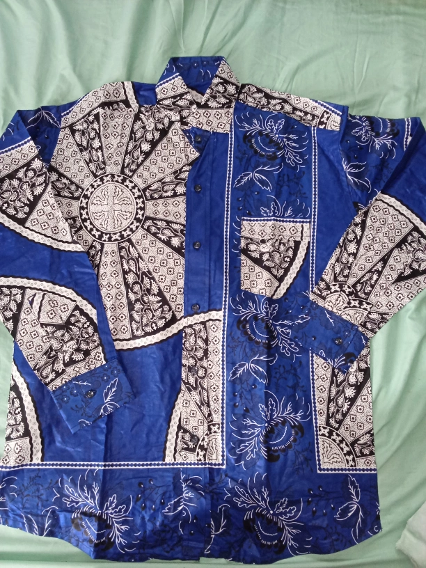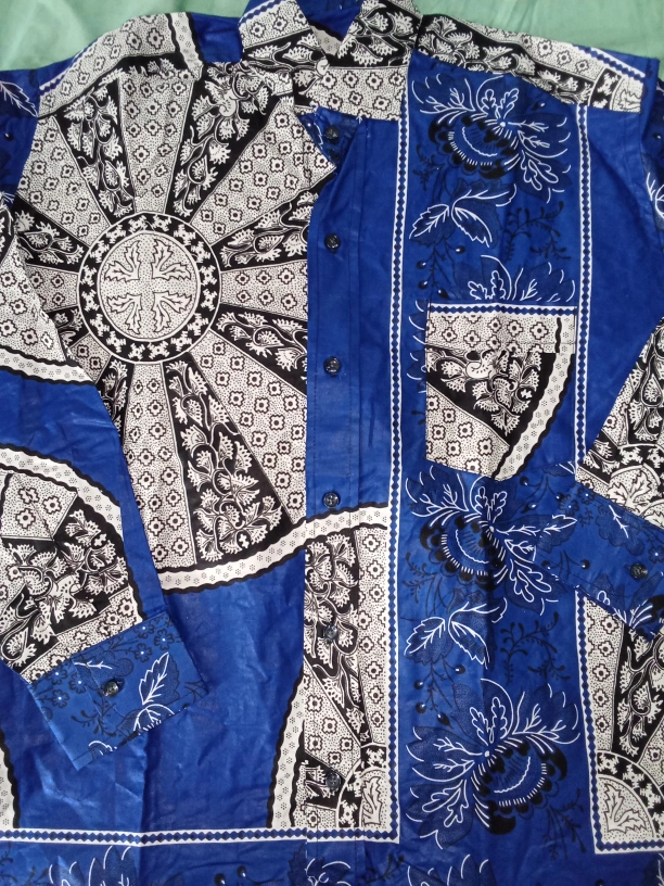 Selling a blue long sleeve shirt with a unique pattern. This shirt is in good condition and features a button-up front with a pocket. The design includes floral and geometric elements in black and white against a vibrant blue background. Perfect for adding a pop of color to your wardrobe!