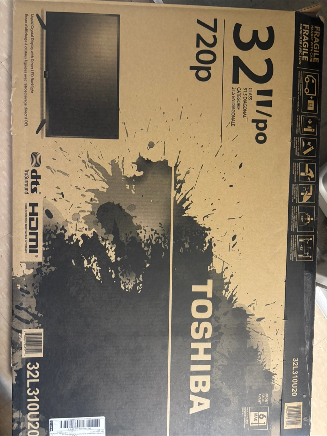 Selling a Toshiba 32-inch TV, model 32L310U20. It's a 720p liquid crystal display with direct LED backlight and TruSurround DTS sound. The box includes handling instructions for safe transport, so you can be sure it will arrive in great shape!