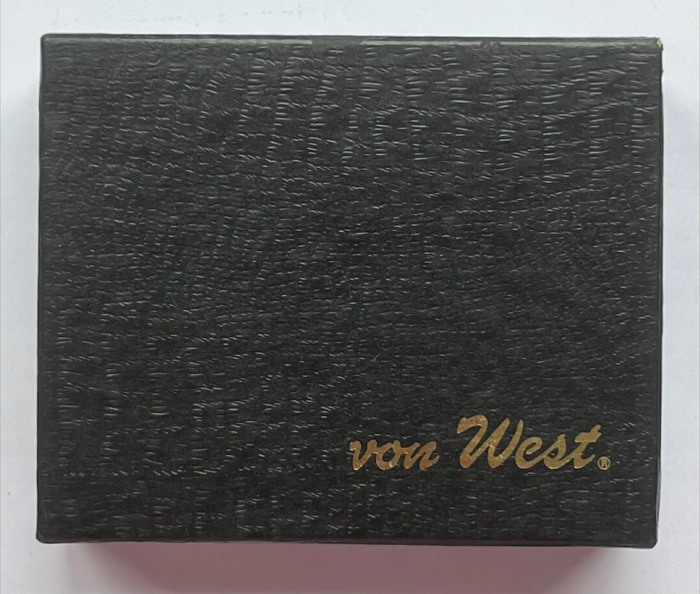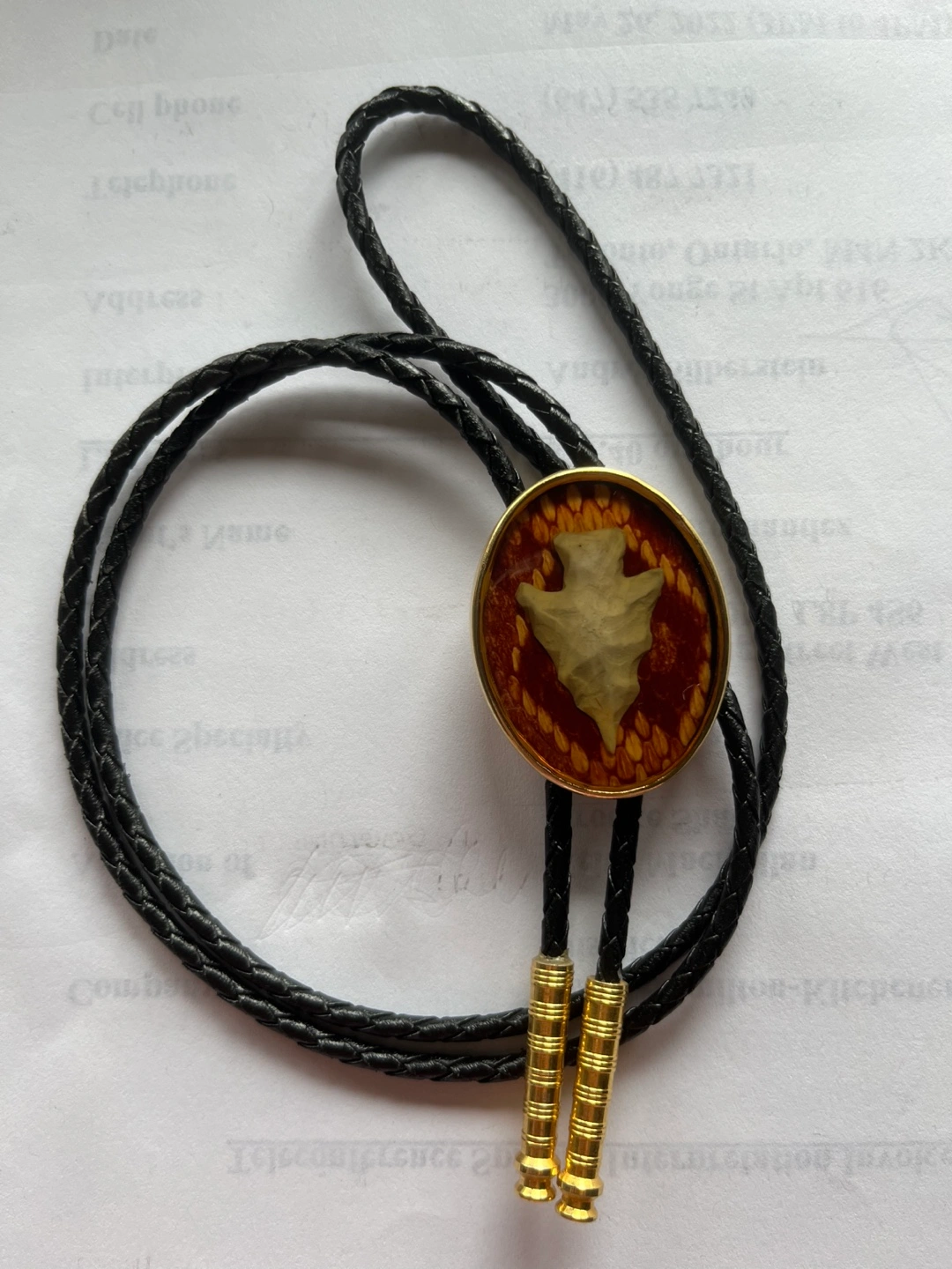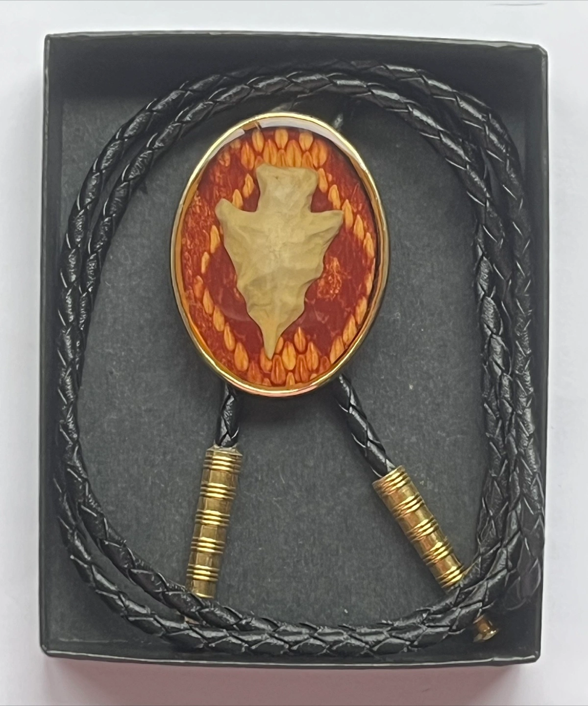 Here's a stylish bolo tie from Von West! It features a unique arrowhead in an oval gold-tone setting with a braided leather black cord and gold-tone tips. It's in great condition and ready to add some flair to your wardrobe.