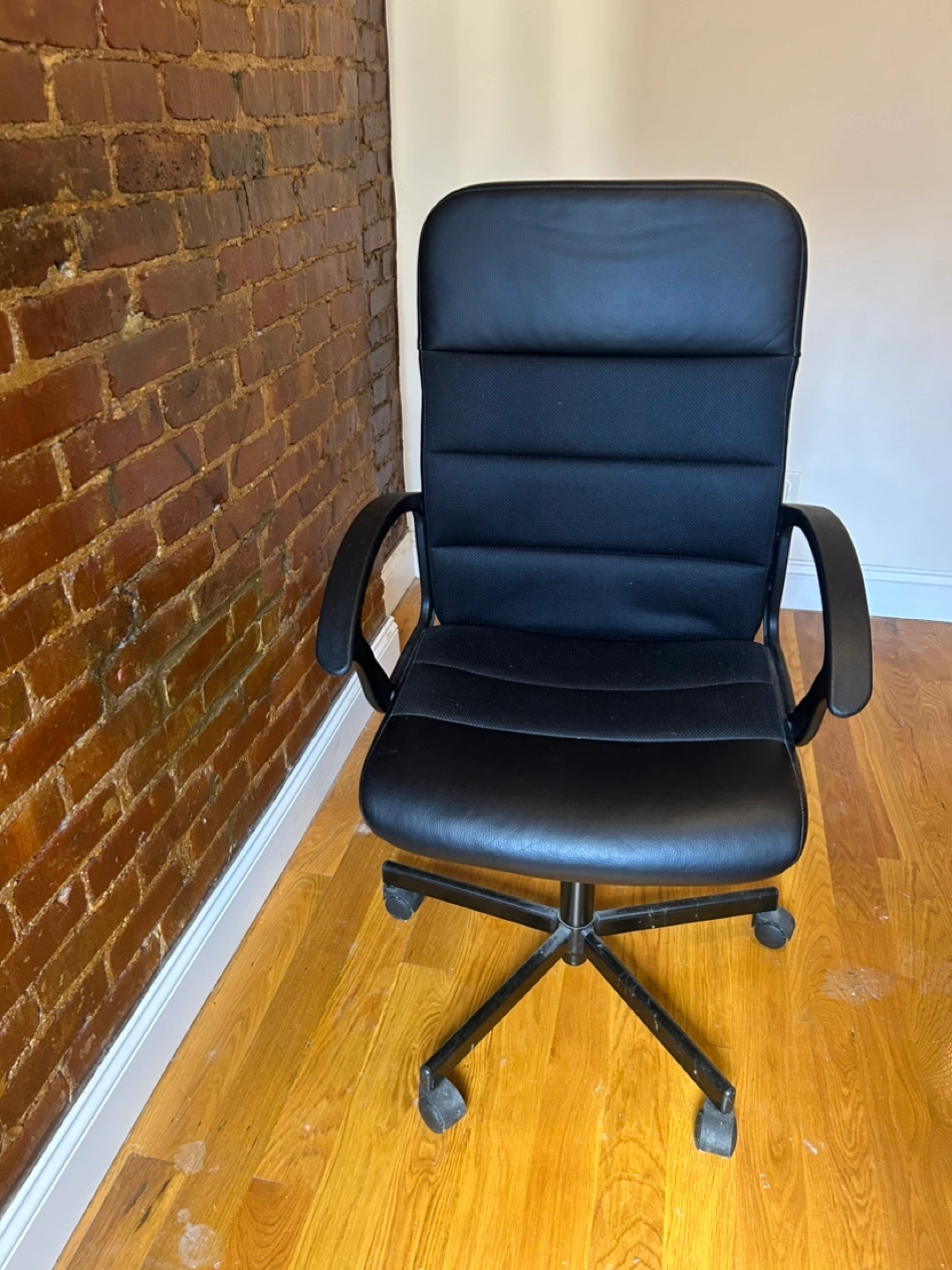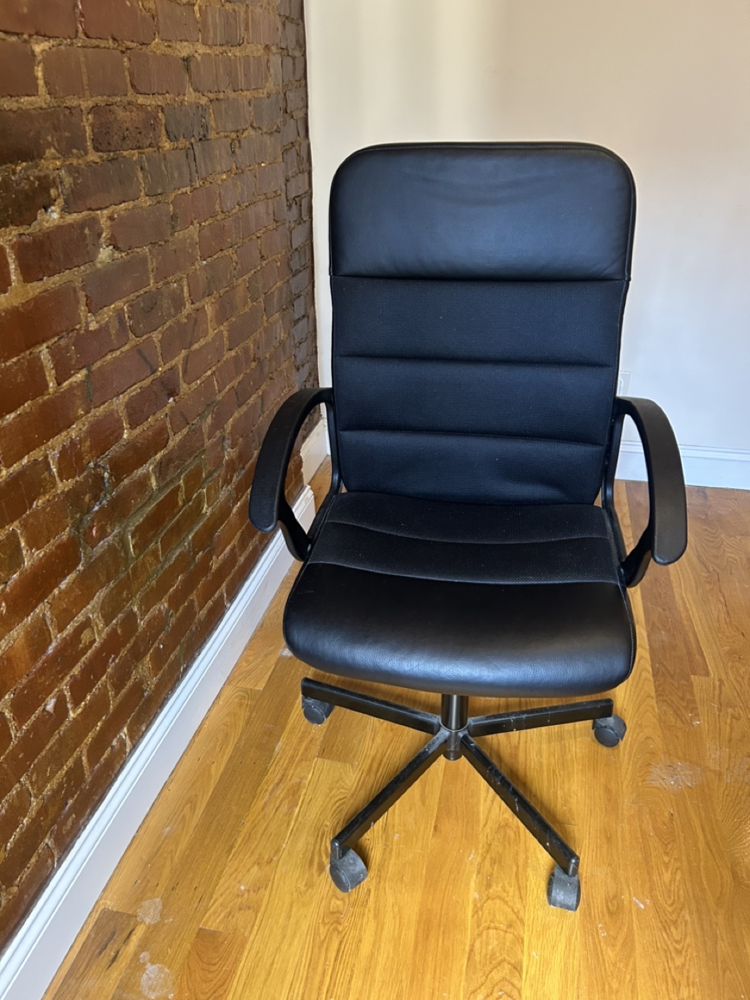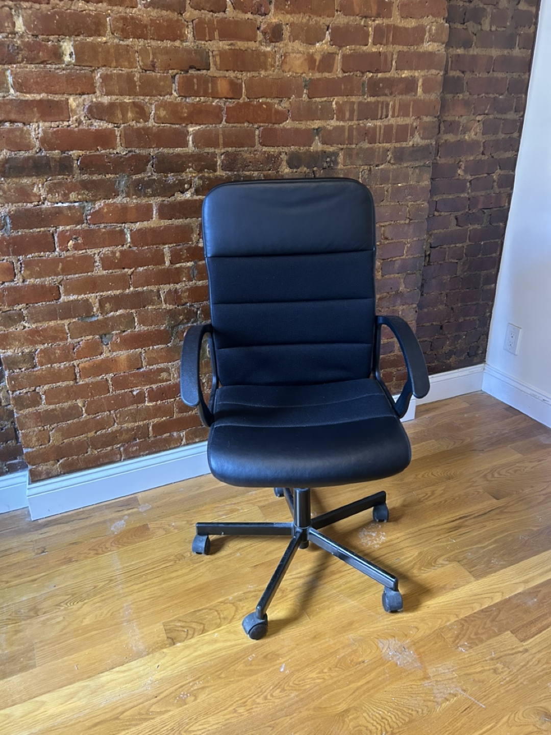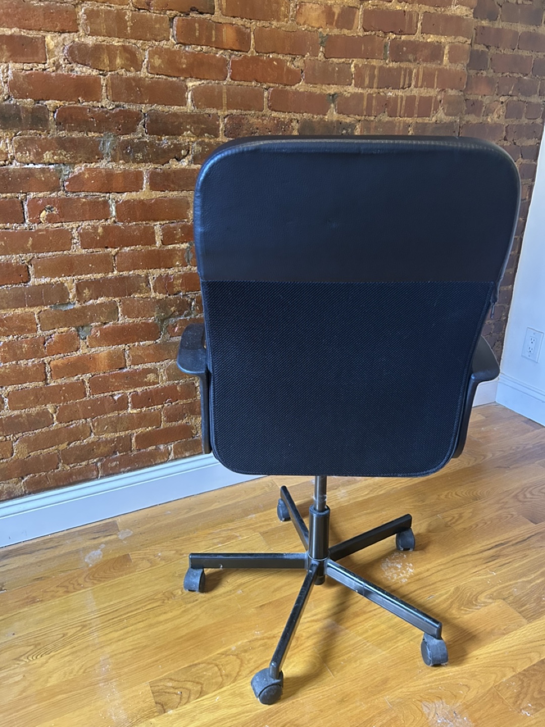 It’s a black executive-style business chair that swivels and has roller wheels. The fabric is in great condition (no holes, etc.) and comes from a non-smoking home.