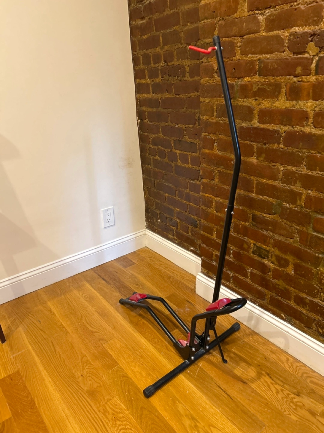 It’s a bike rack that stores your bike vertically with the back tire in the bottom track and the front tire resting on a non-scratch hook — great for small apartments and buildings without a dedicated bike room.