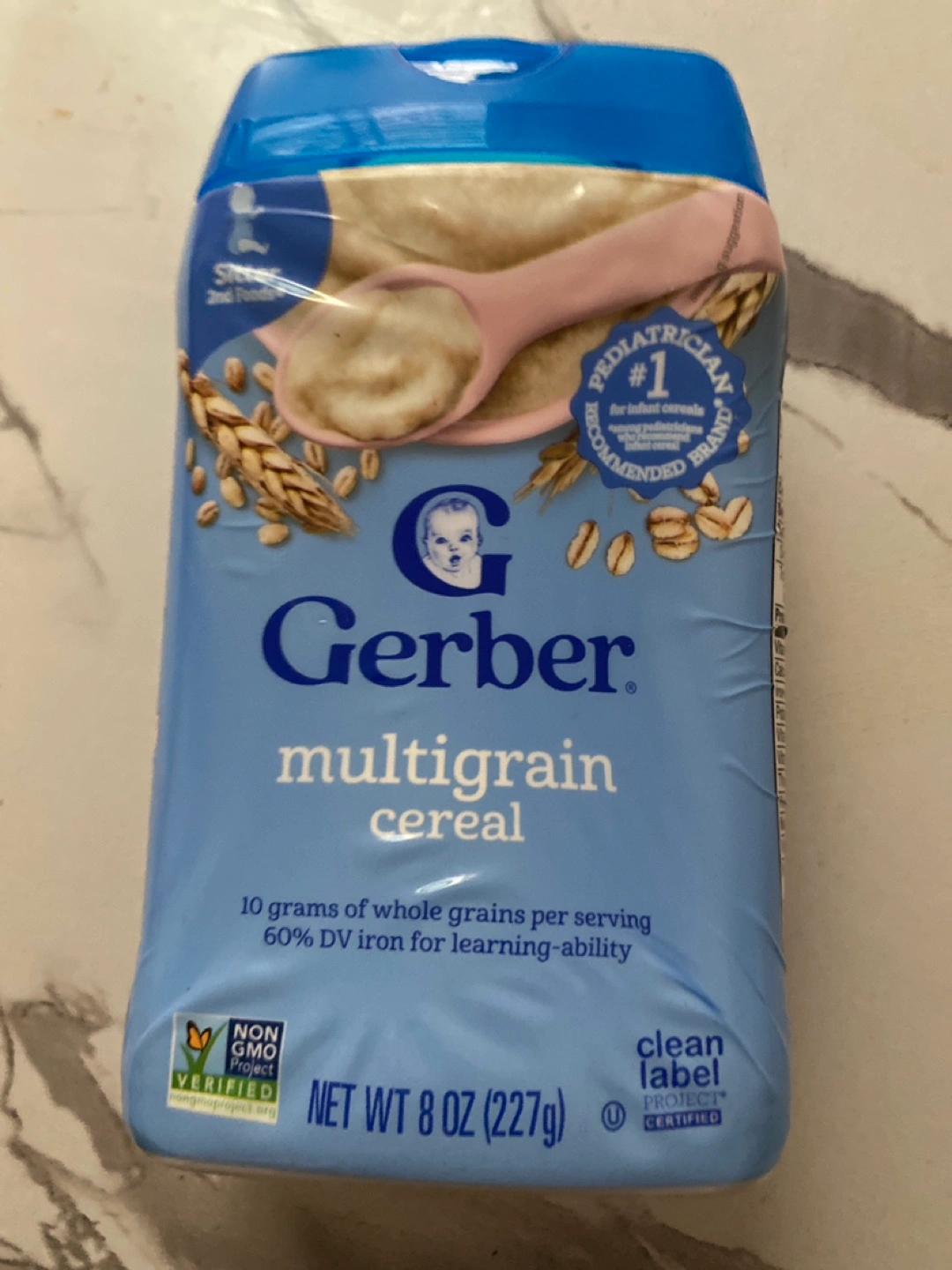 Selling a container of Gerber multigrain cereal. It contains 10 grams of whole grains per serving and 60% DV iron for learning-ability. Net weight is 8 oz (227g). It is pediatrician recommended!#freecycle. Someone may need it