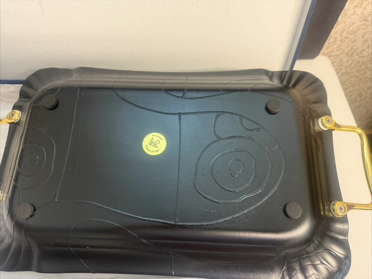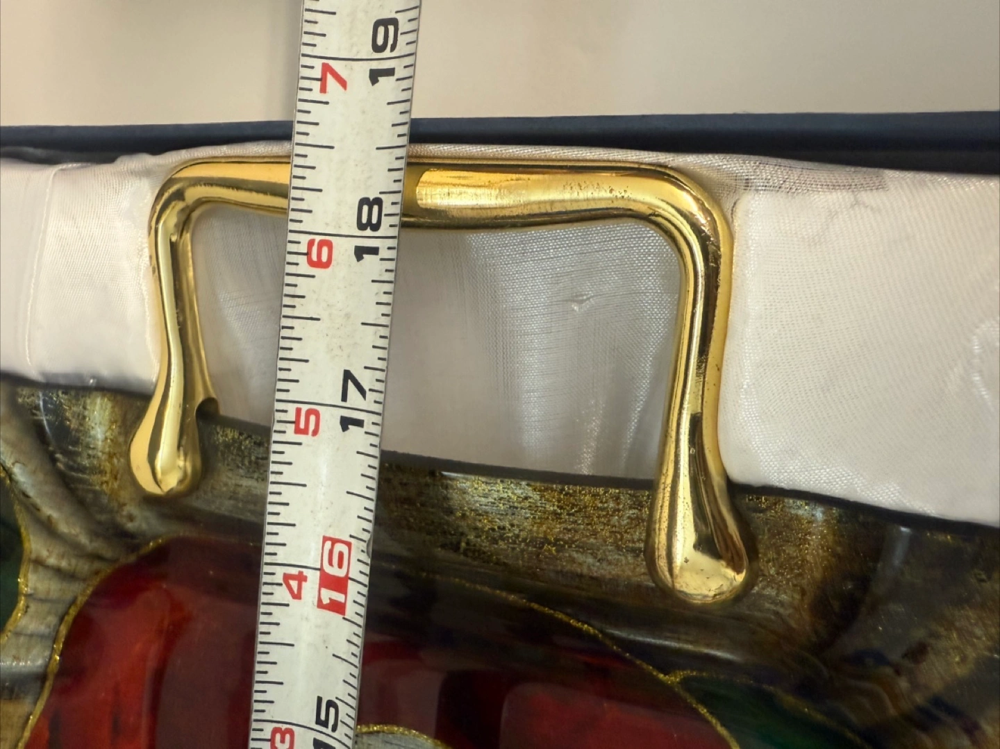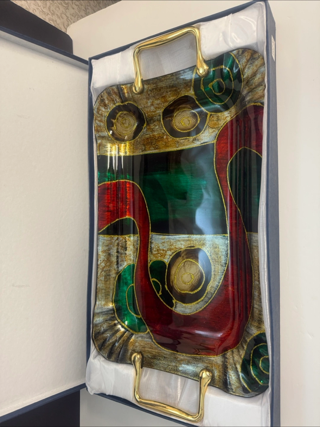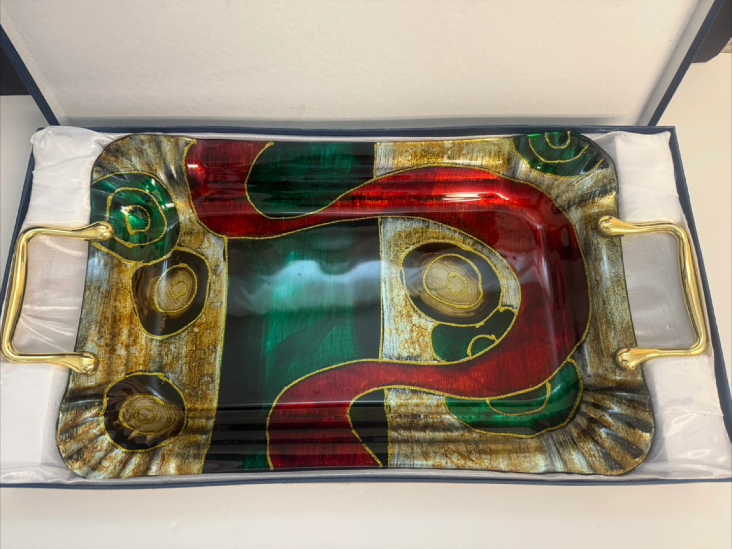 Selling a beautiful art glass serving tray! It features unique designs in red, green, and gold tones, complemented by sturdy gold-tone handles. The tray comes with its original box, making it perfect for gifting or adding a touch of elegance to your serving collection