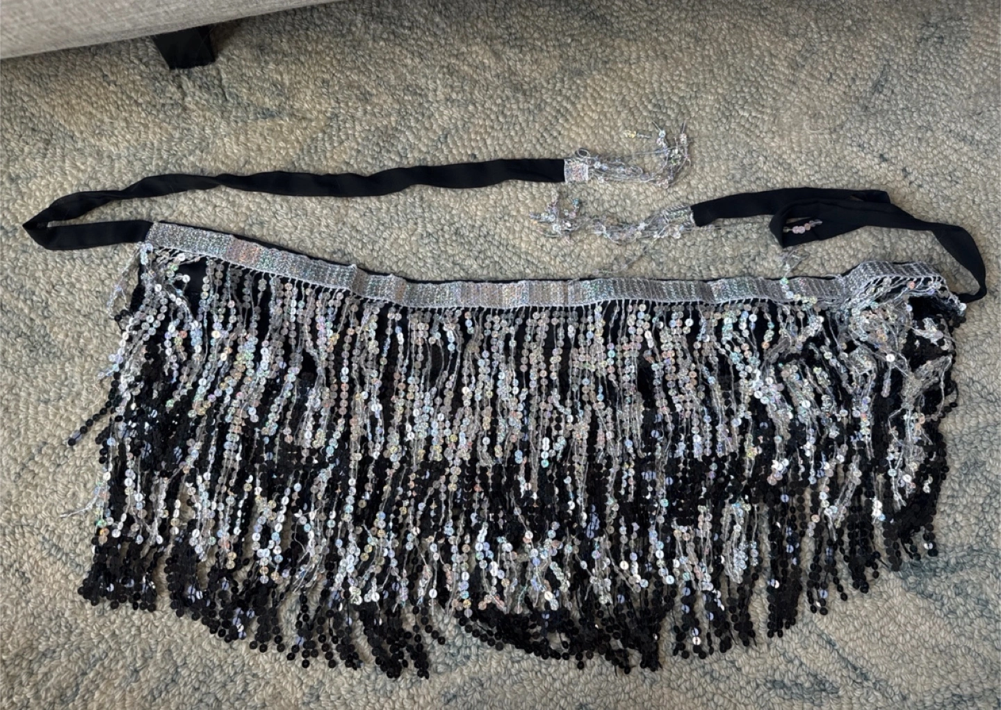 Selling a cute belly dance hip scarf! It's black with silver sequins and beads, adding a fun sparkle to your dance moves. Perfect for practice or performance!