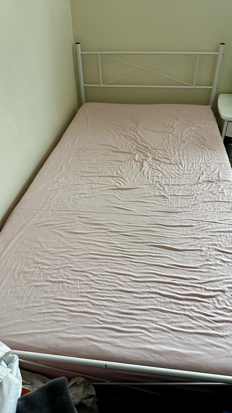 Selling a twin-sized Casper mattress along with a white metal bed frame with headboard and footboard. It was in guest room so barely used and the frame is nearly new with the original stickers still on. I upgraded in size so I don’t need this anymore! Bed sheet not included. I will disassemble before pickup. Yes it’s available