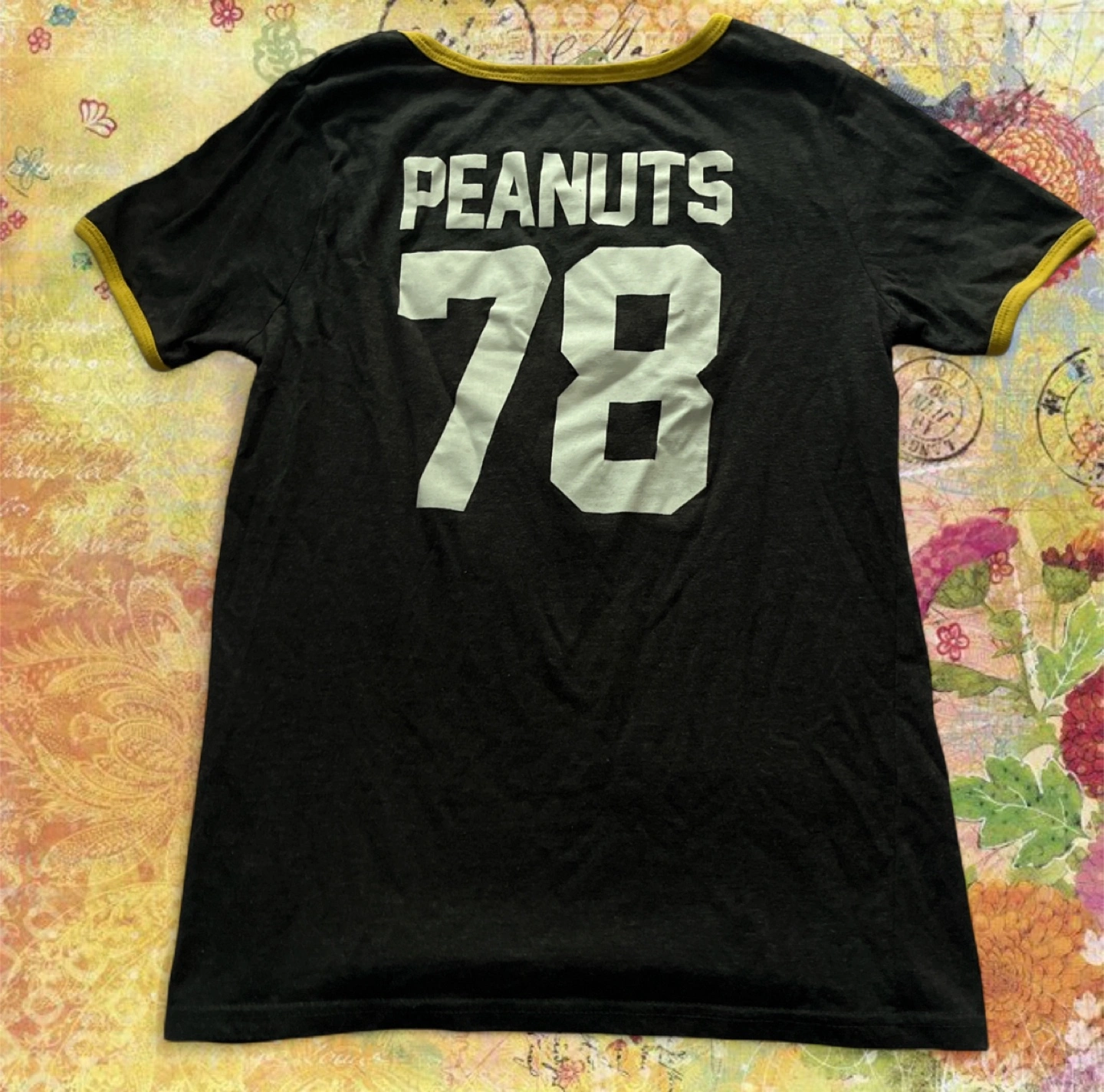 it’s a dark grey t-shirt with yellow trim, featuring snoopy as joe cool on the front and the number 78 on the back ♡