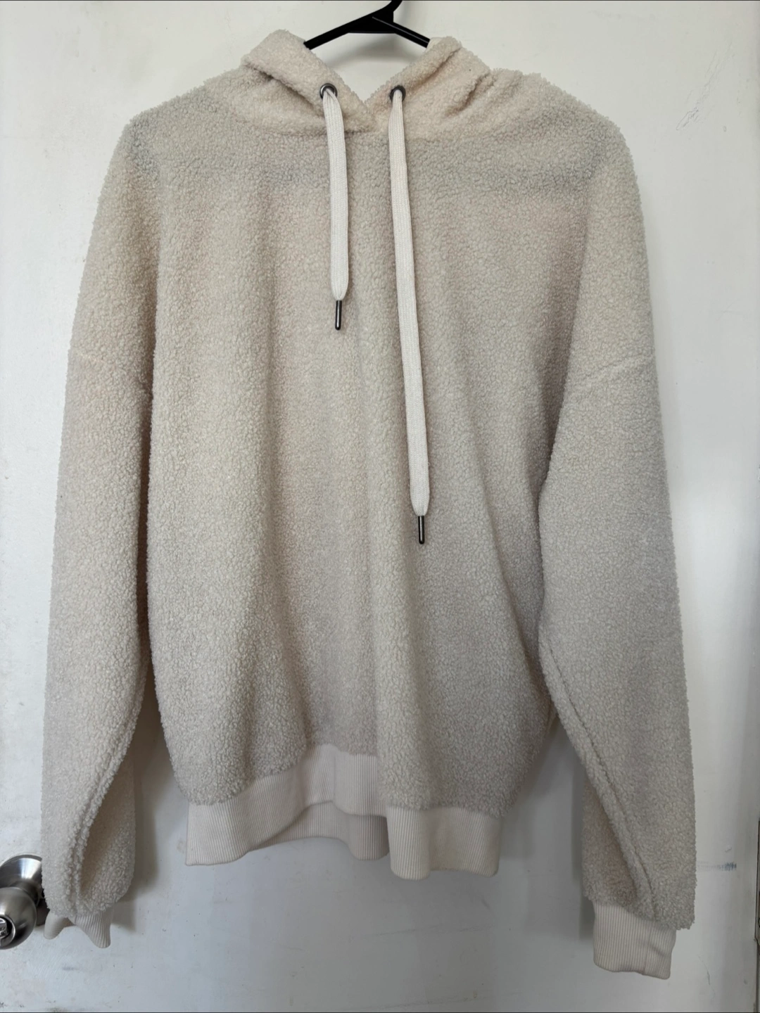 Selling a cozy beige sherpa hoodie! It's in great condition and perfect for staying warm on chilly days. The hoodie features a soft, textured sherpa material and a comfortable, relaxed fit. It has a hood with drawstrings and ribbed cuffs.