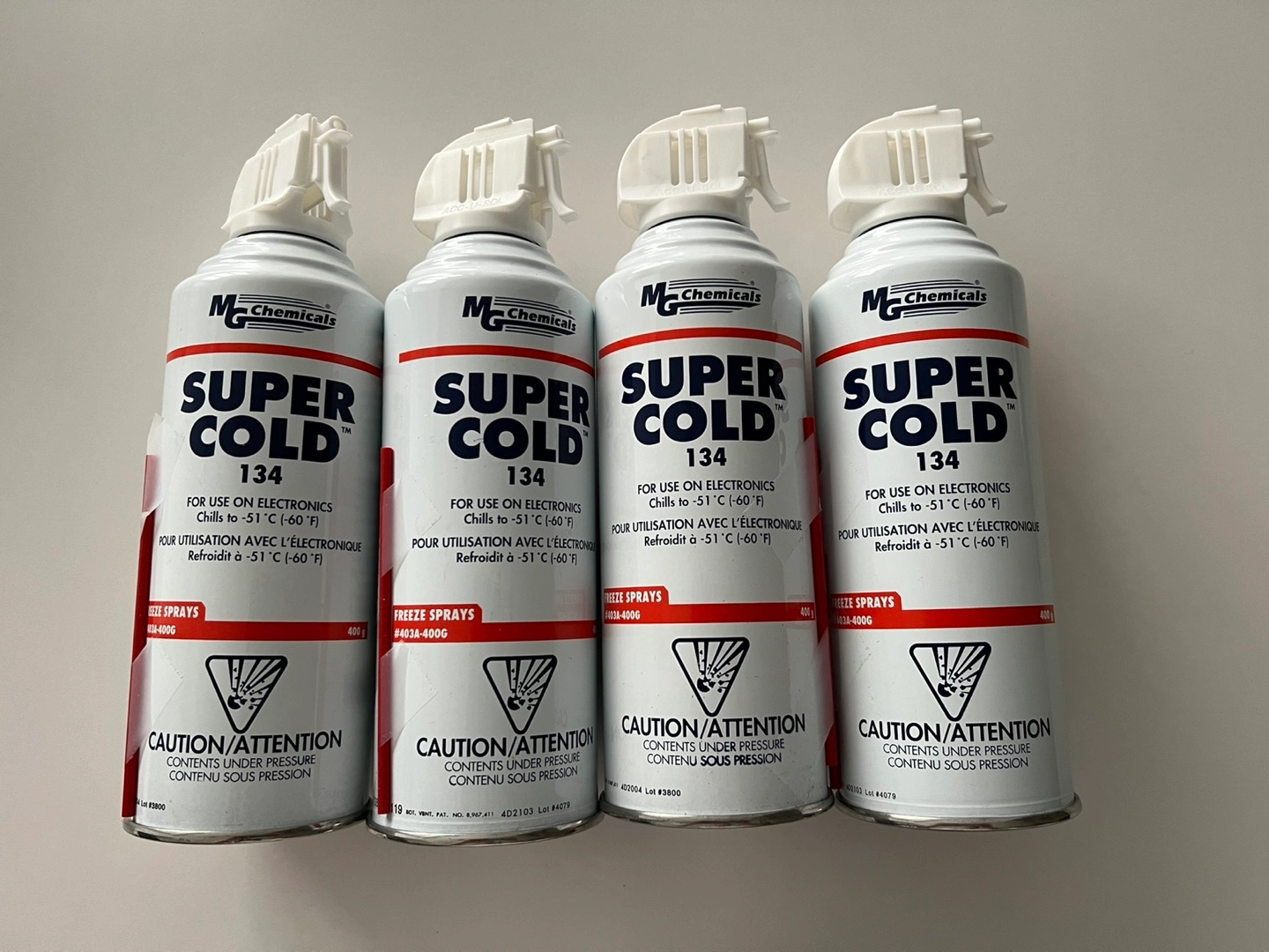 Selling 4 cans of M.G. Chemicals Super Cold 134 freeze spray. These are great for electronics and can chill to -51°C (-60°F). Each can contains 400g of spray.