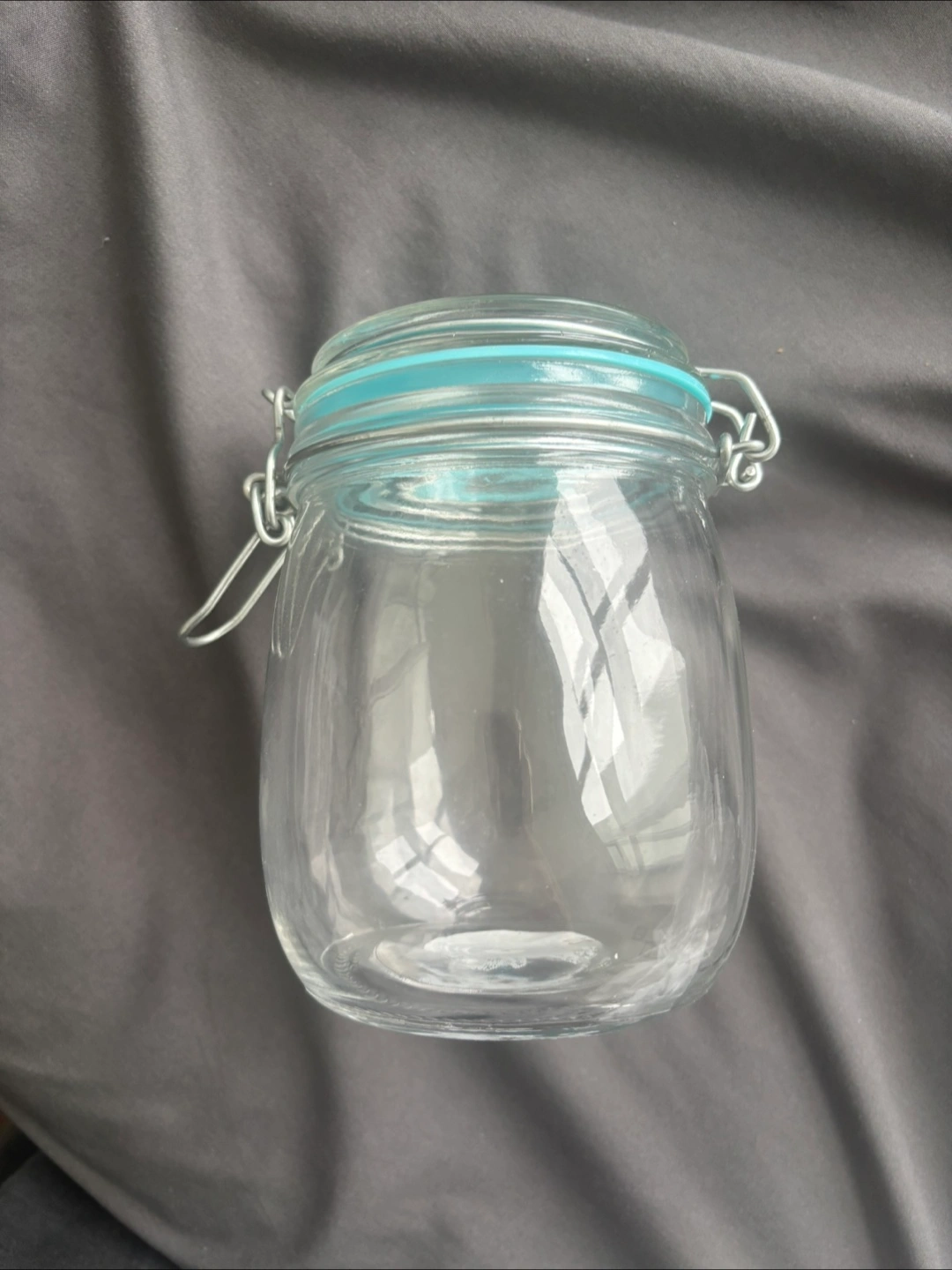Selling a clear glass jar with a blue lid. It's in great condition and ready for a new home. Perfect for storing various items around the house!