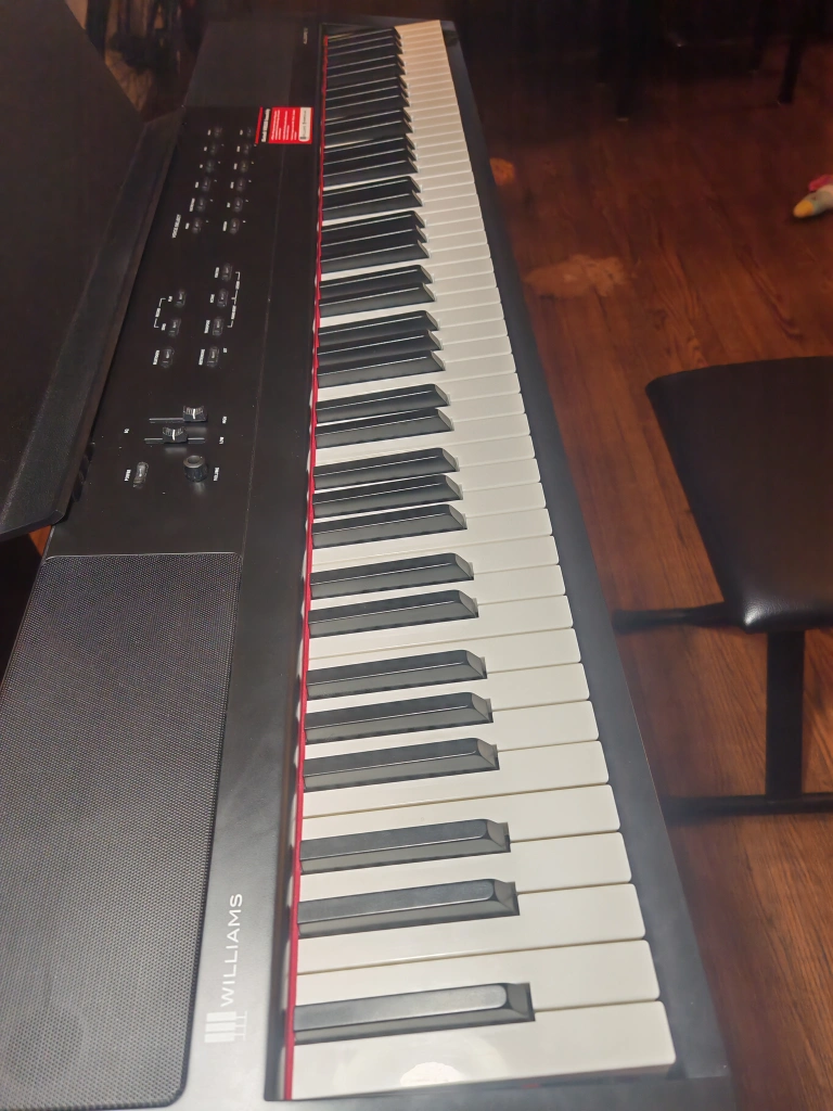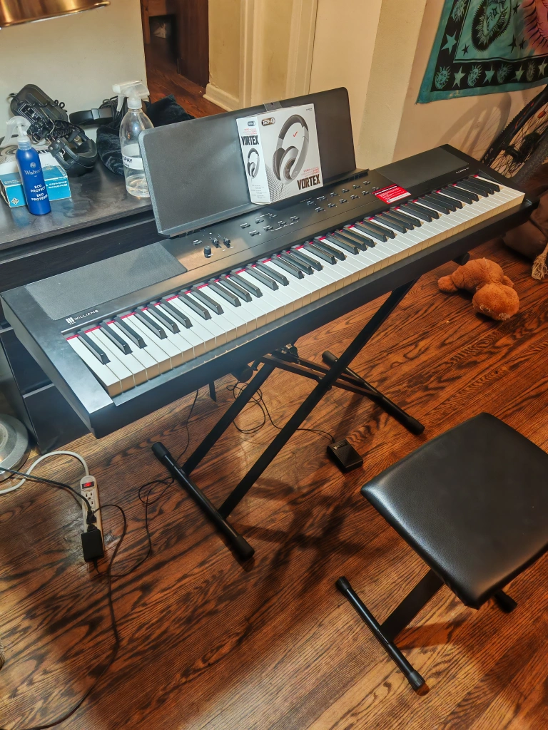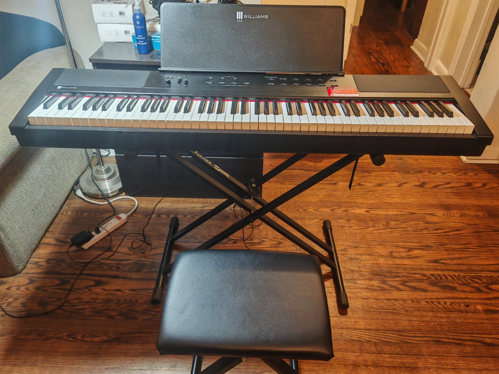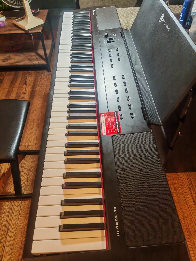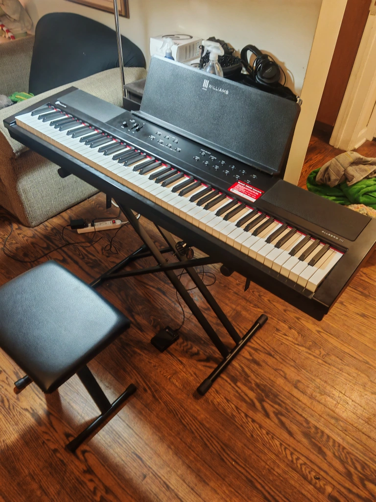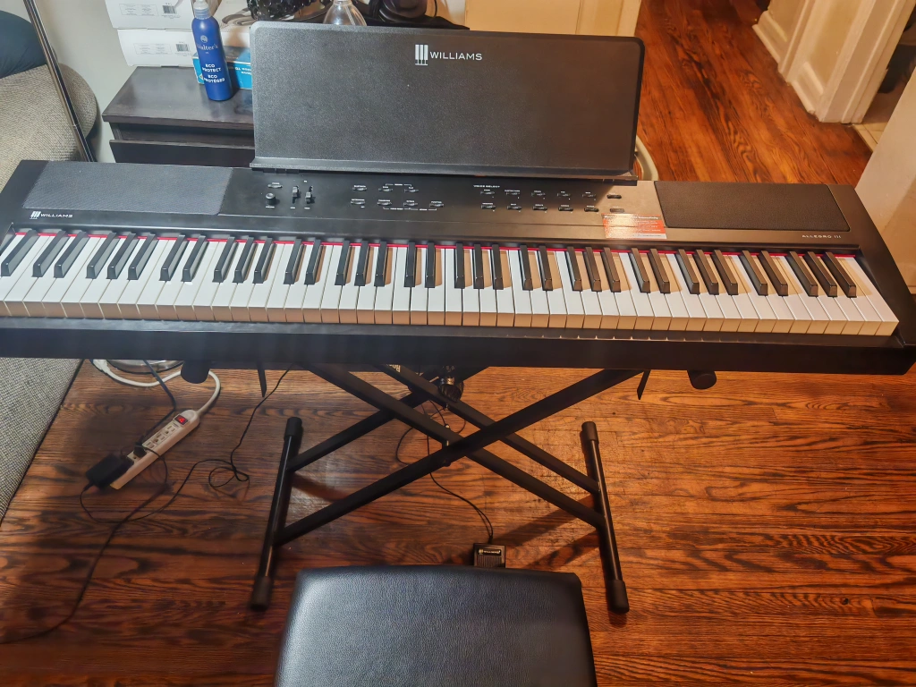 Williams Allegro III, 88 fully weighted keys digital piano like new condition. It comes with stand, music rest, power adapter, headphones, sustain pedal and stool.