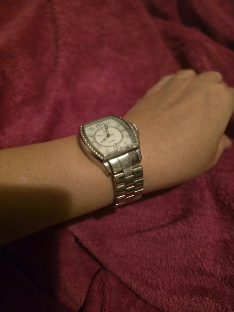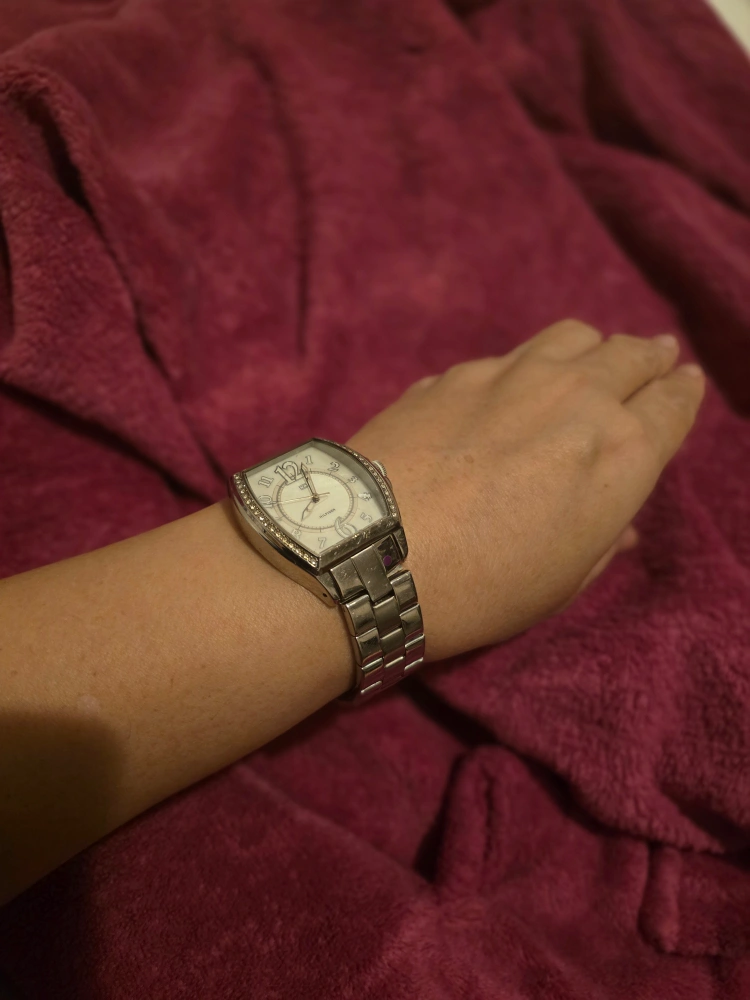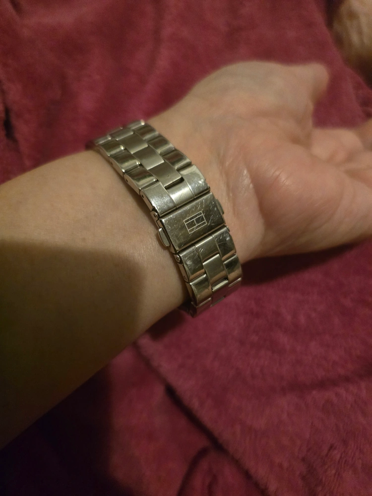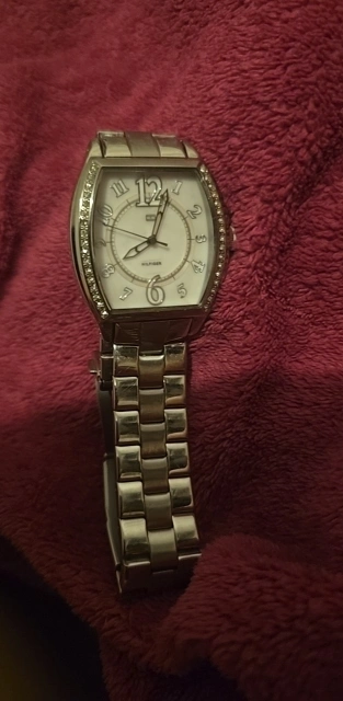 Selling a Tommy Hilfiger women's watch with a silver band. It has a unique rectangular face with crystal accents. A stylish accessory for any outfit! good working condition.
