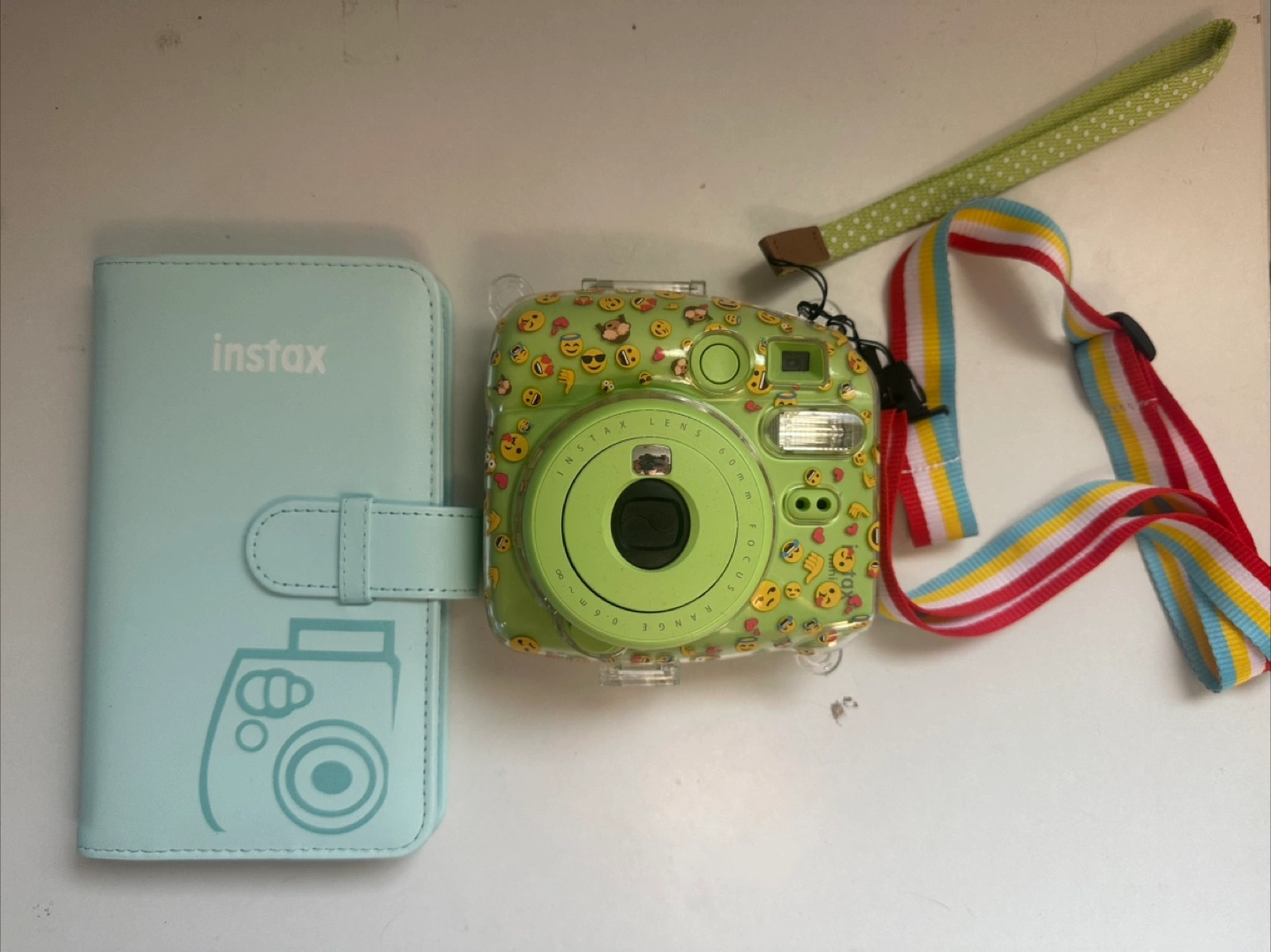 Selling a cute Instax Mini 9 camera in lime green! It comes with a fun emoji-themed protective case and a colorful strap. Also included is a light blue Instax camera case to keep it safe and sound