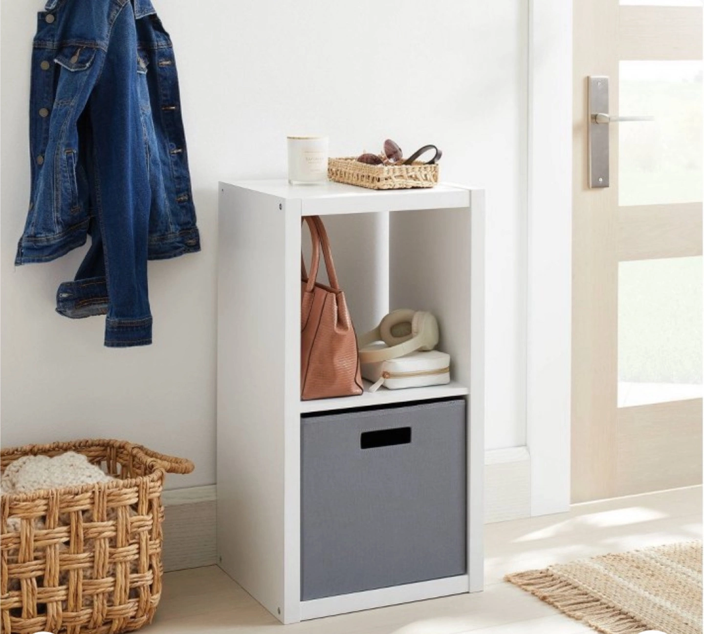 I'm selling a cube storage shelf! It's a great way to add some extra storage space to any room. It includes a gray storage bin as well. Perfect for organizing books, toys, or anything else you need to keep tidy