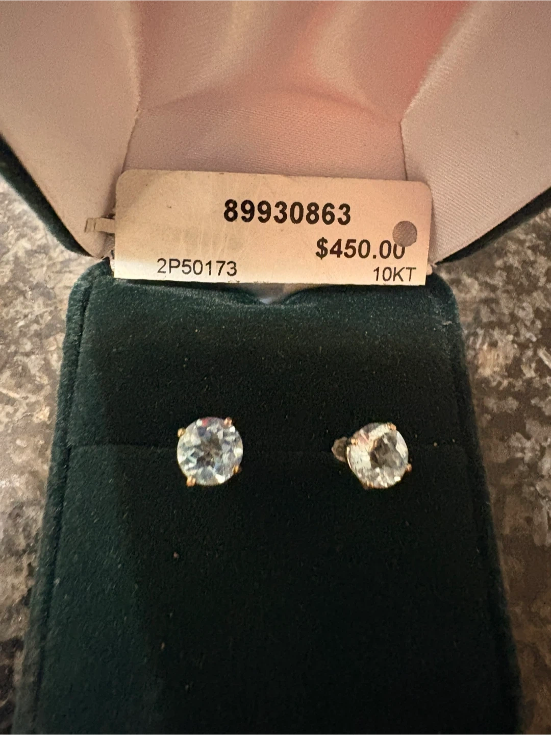 These are a pair of 10KT stud earrings with blue topaz stones. They come with their original box and the price tag shows they were originally and-never been worn. White gold