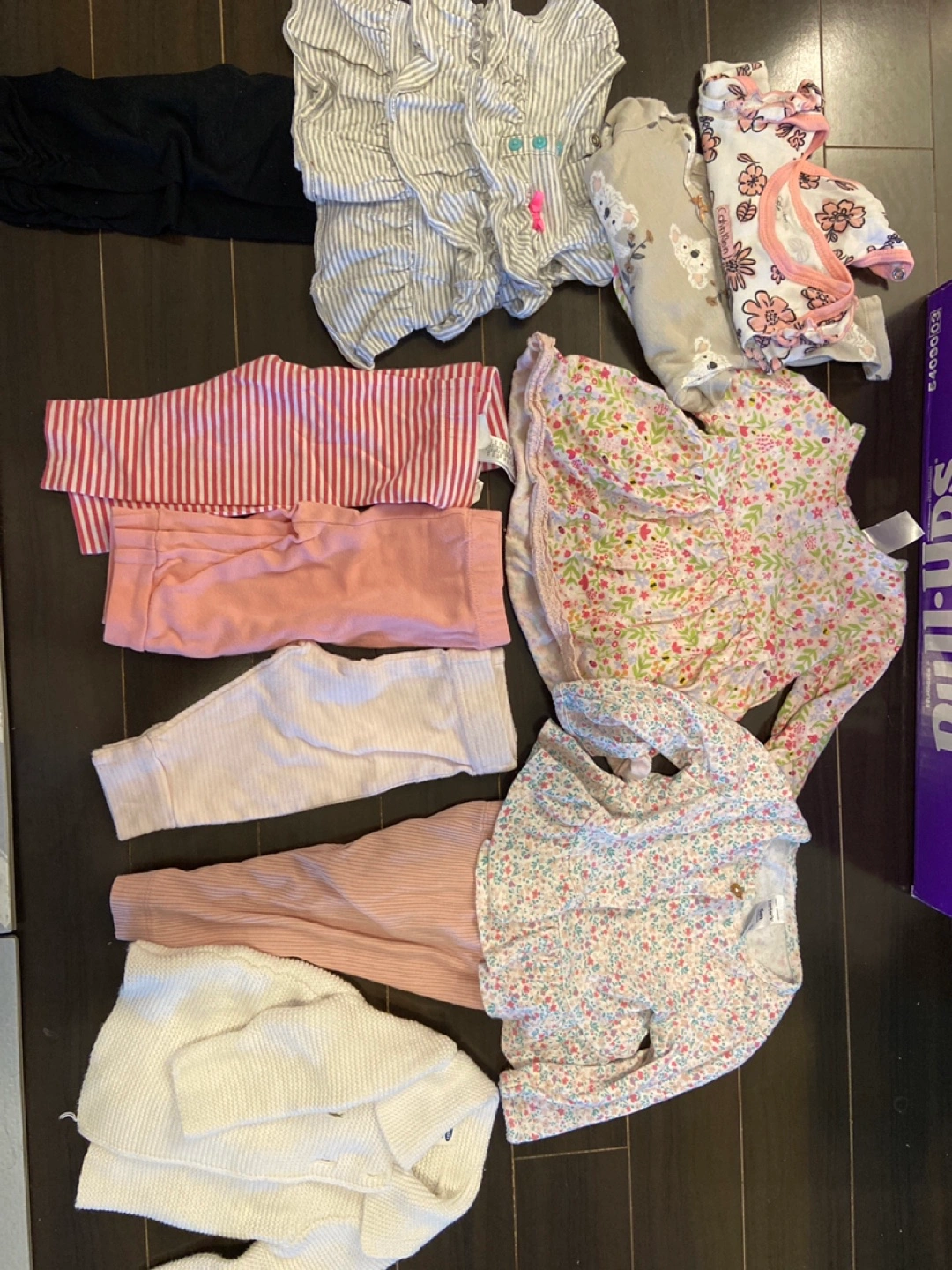 Selling a bundle of adorable baby girl clothes! Includes a variety of tops, bottoms, and a cute cardigan. All in great condition and ready for a new little owner