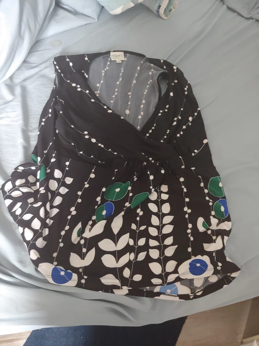 This is a Cleo Petites blouse in size L/G. It features a black background with a floral and polka dot pattern. It's in great condition and ready for a new home