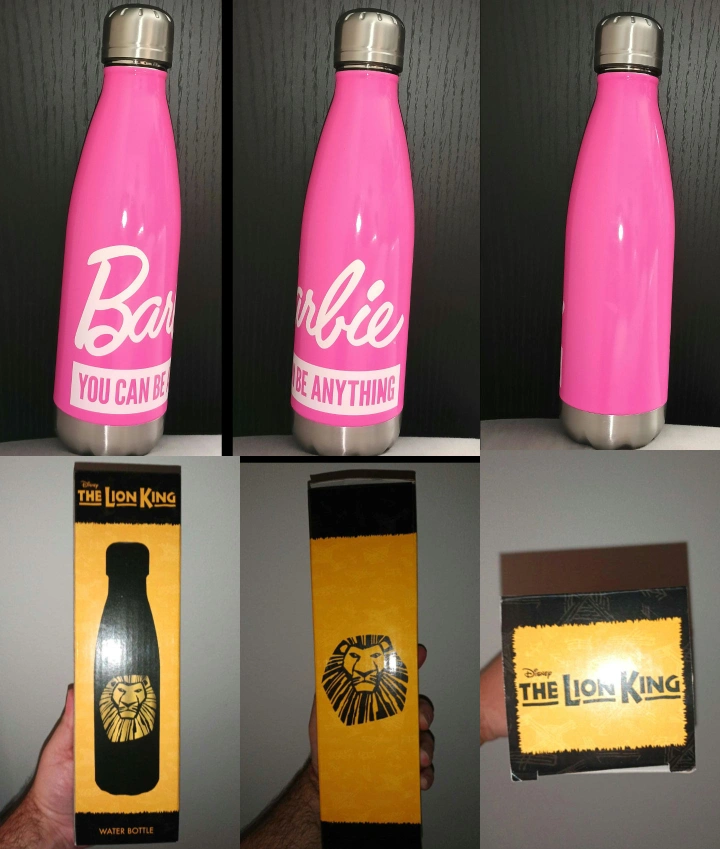157The Lion King bottle hasn't been used. Barbie bottle is slightly used. Both are about 18-20 oz. Barbie paint job is intact. Hand wash only. Not microwaveable and not freezable