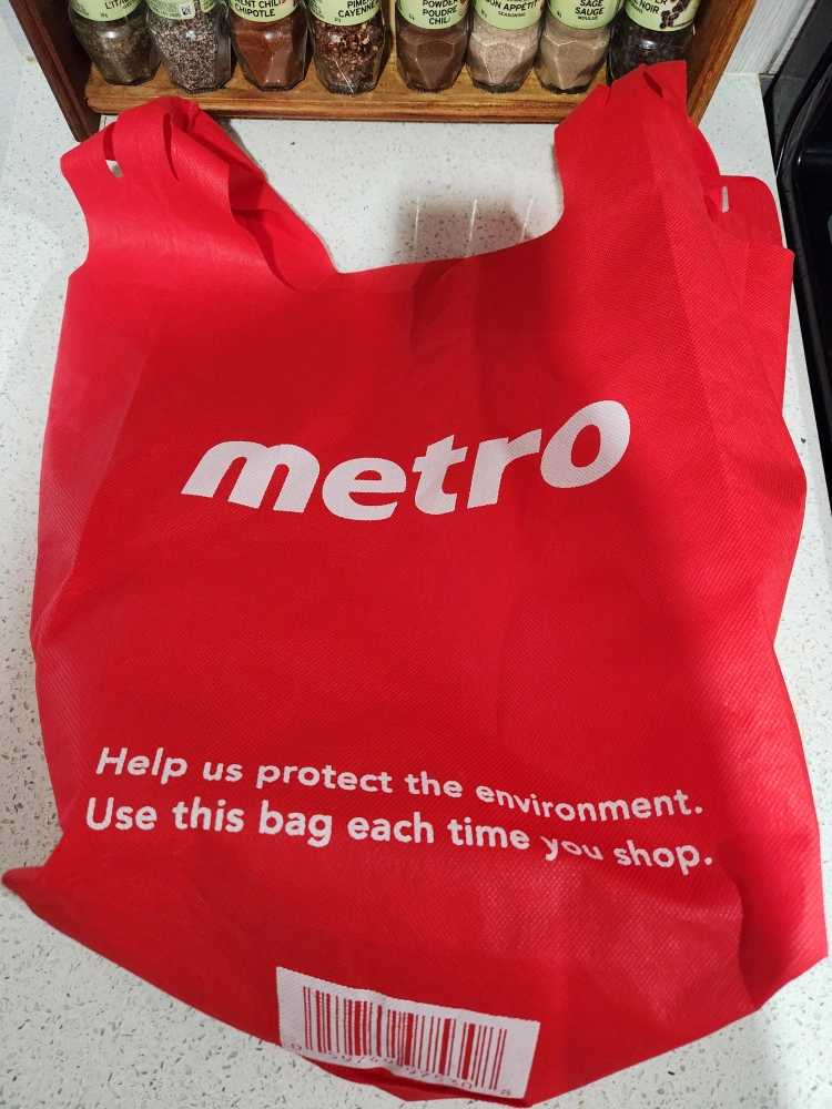 Red reusable shopping bag from Metro! It's in great shape and ready to help you protect the environment on your next grocery run