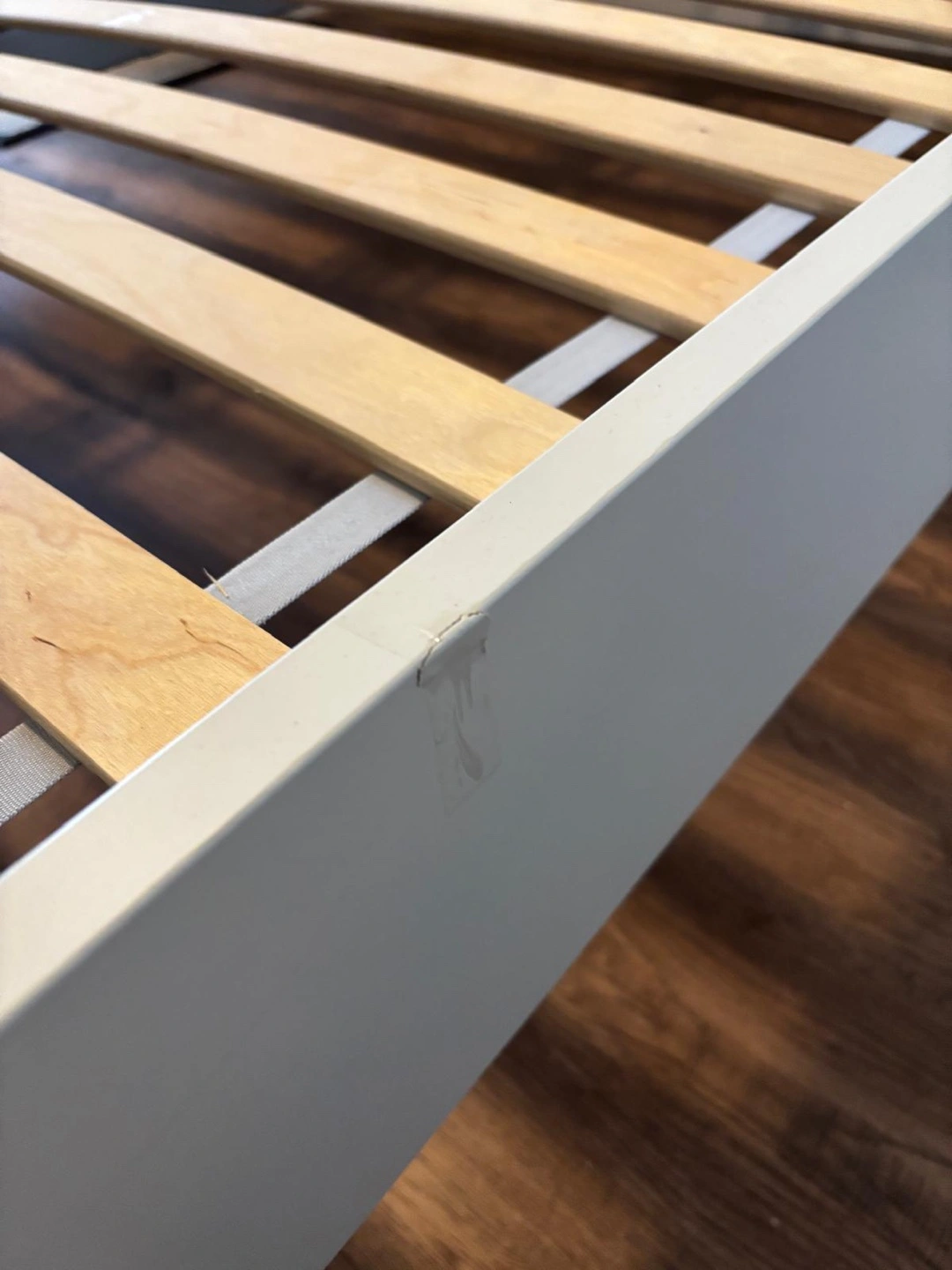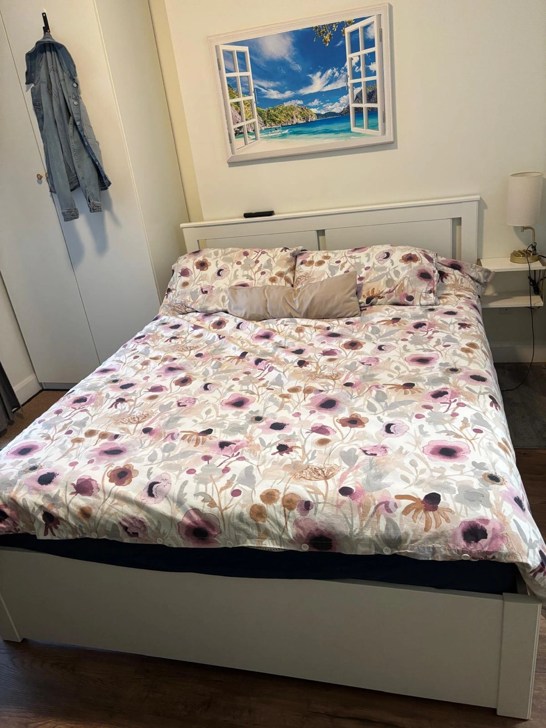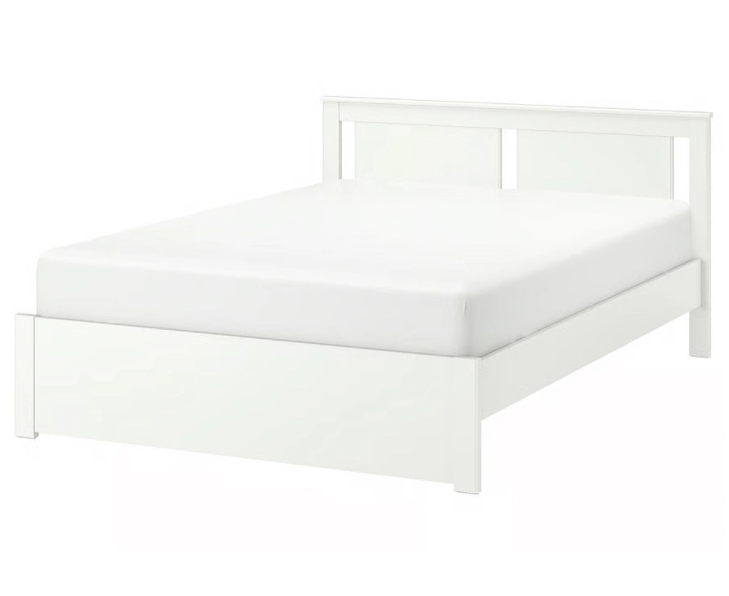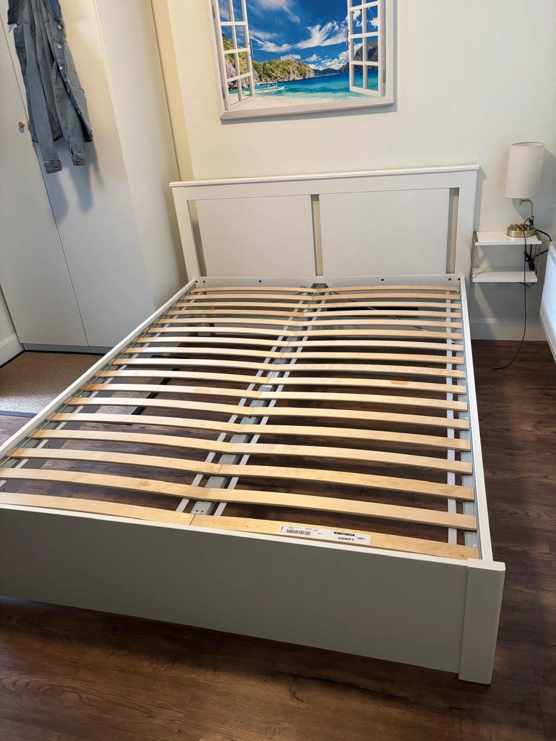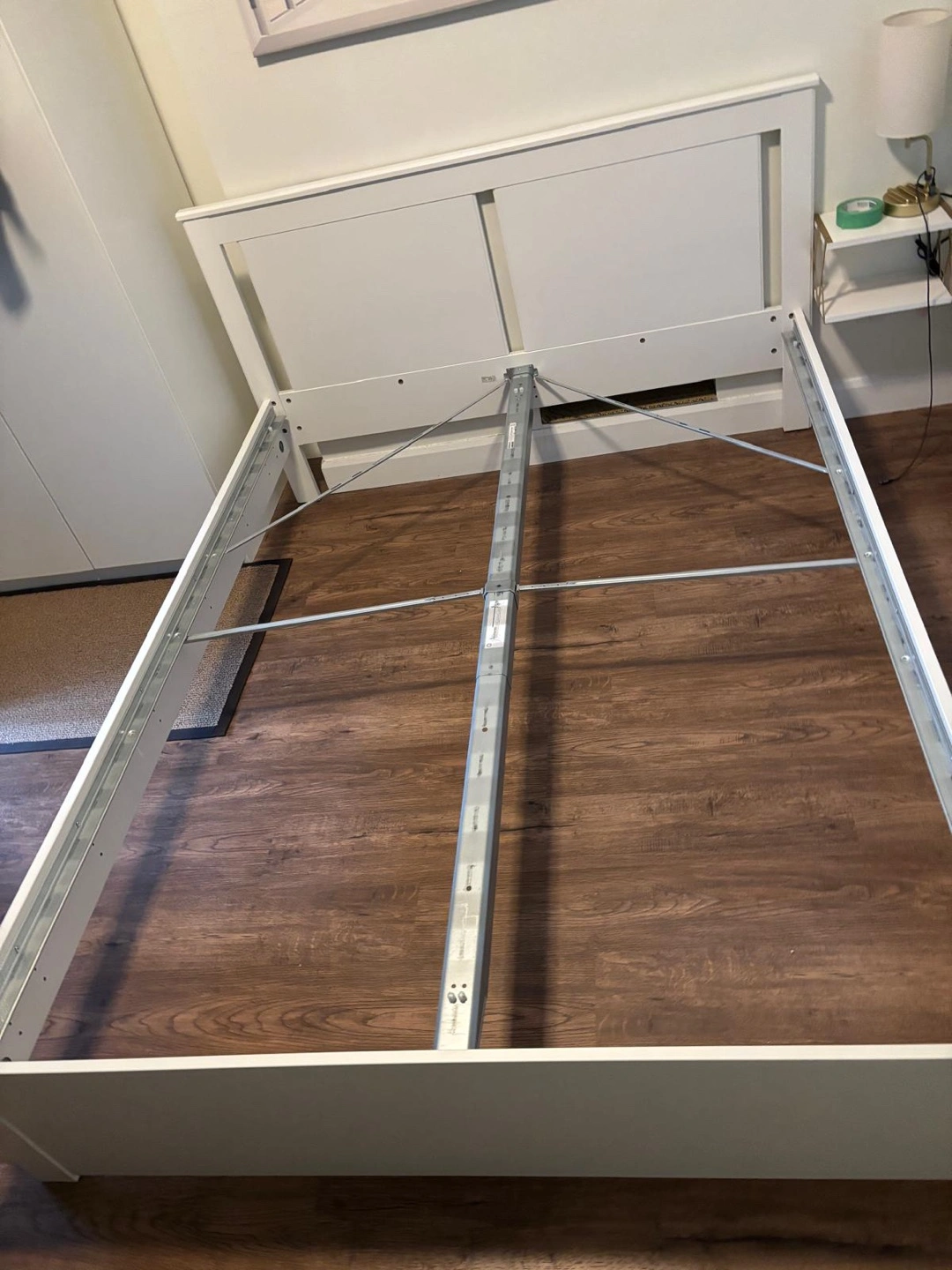 188Selling a white IKEA Hemnes queen bed frame. It's in good condition. There is a bit of wear and tear on one side, as shown in the photos. The bed frame is sturdy and reliable, perfect for any bedroom!