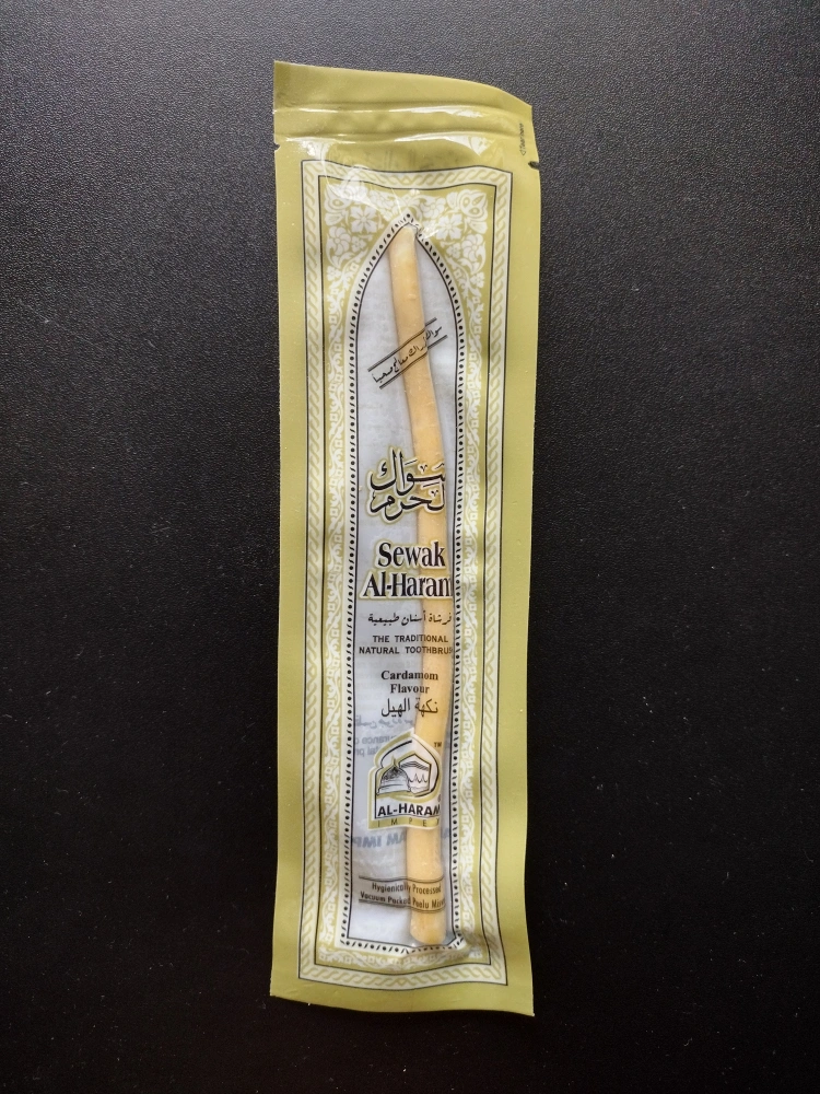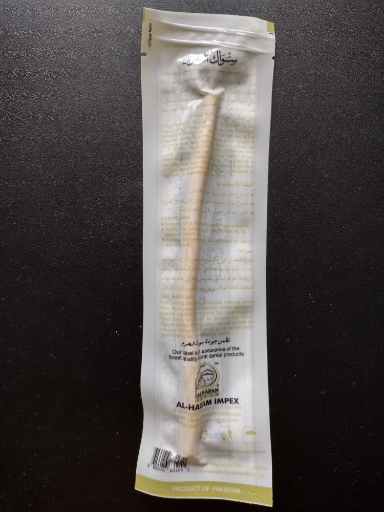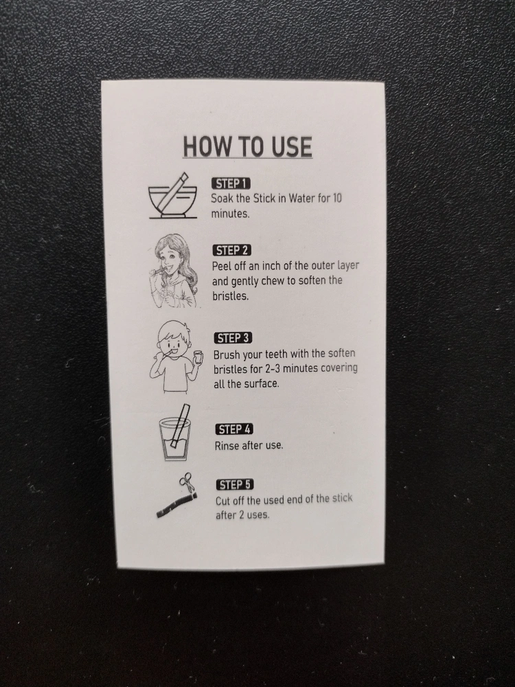 Sewak Al-Haram Traditional Toothbrush. It's a natural toothbrush that comes in Cardamom flavor. To use, soak the stick in water for 10 minutes, peel off an inch of the outer layer, and gently chew to soften the bristles. Then brush your teeth with the softened bristles for 2-3 minutes, covering all surfaces. Rinse after use and cut off the used end of the stick after 2 uses.