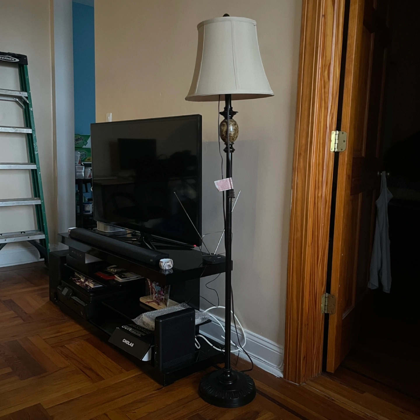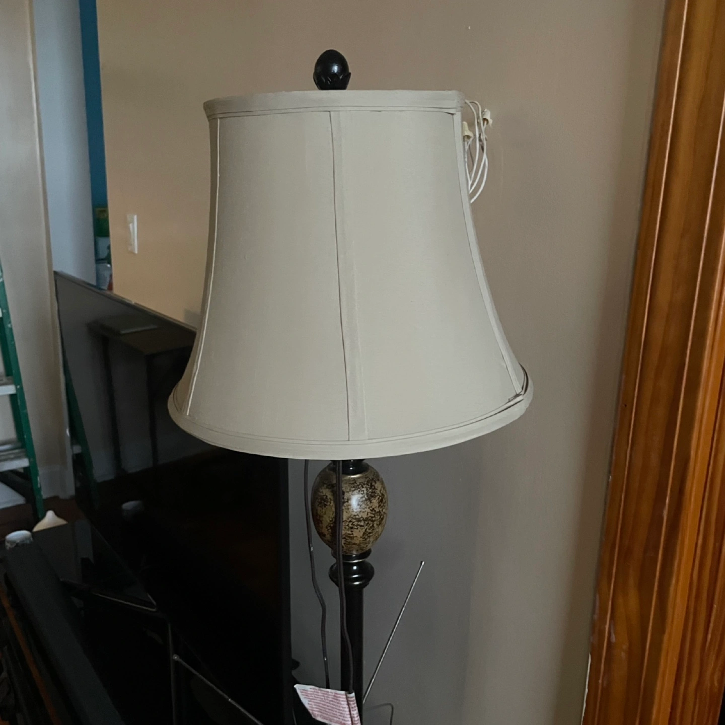 Here's a floor lamp with a beige shade. It's in good condition and would look great in any room. The lamp has a decorative base and a classic design. It stands tall and provides ample light. Perfect for adding a touch of elegance to your home!
