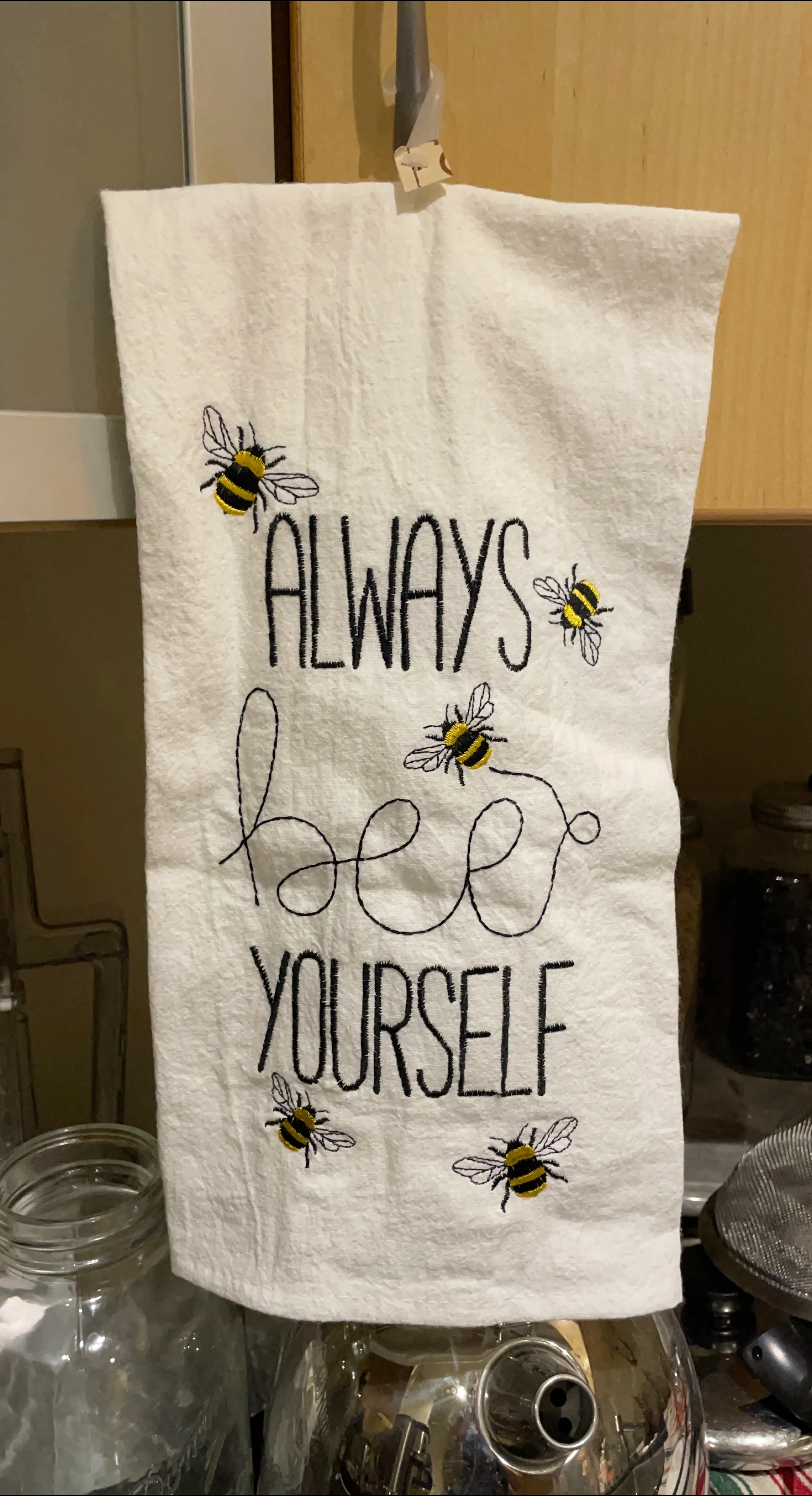 A cute cotton tea towel with embroidered bees and the words 'Always bee yourself'! Brand new with tags.