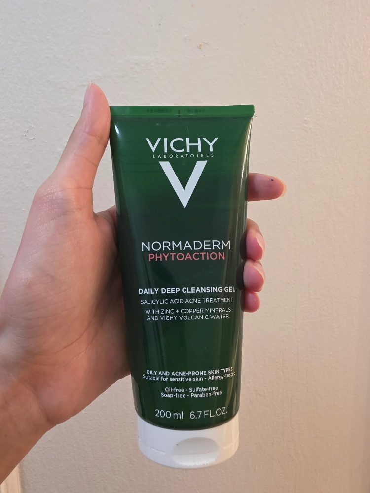 I'm selling Vichy Normaderm PhytoAction Daily Deep Cleansing Gel. It's a daily deep cleansing gel with salicylic acid acne treatment, zinc, copper minerals, and Vichy volcanic water. It's suitable for oily and acne-prone skin types, allergy-tested, oil-free, sulfate-free, soap-free, and paraben-free. It contains 200 ml / 6.7 FL.OZ.