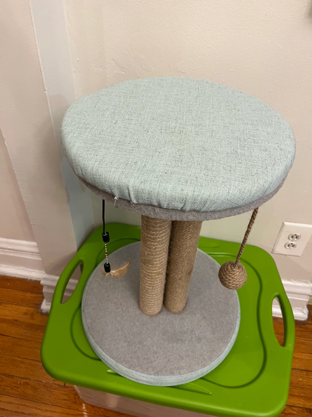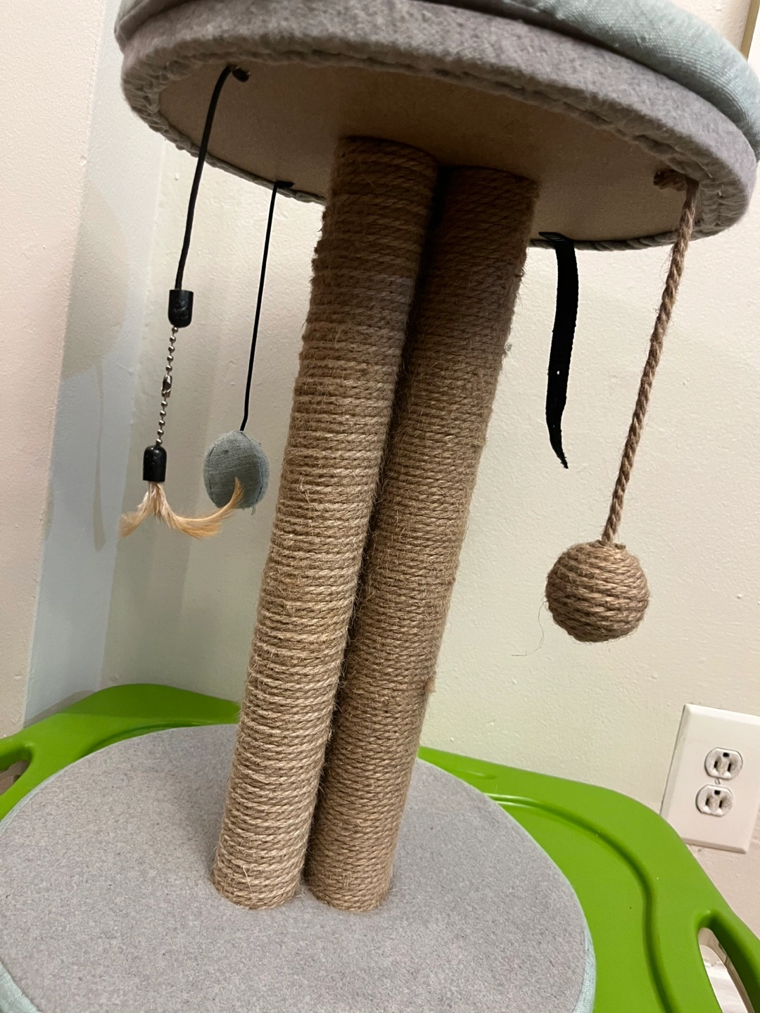 This is a cat scratching post tree. It has a round top and bottom and sisal rope posts. It's in good condition and ready for a new home.