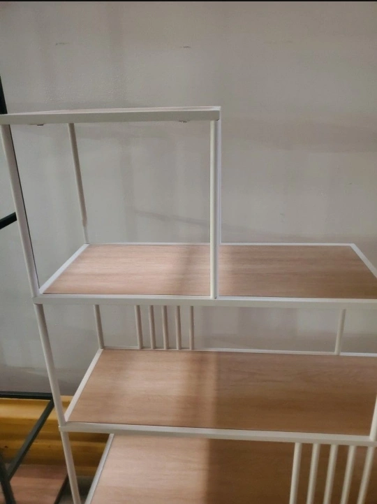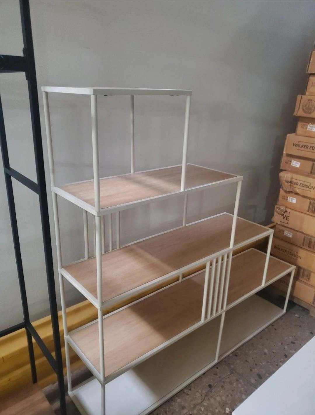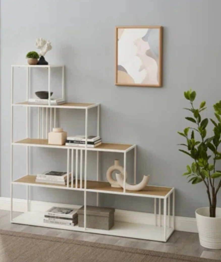 Here's a Walker Edison 4-shelf bookcase with a modern design. It features a white metal frame and natural-colored shelves. This stylish piece can add a unique touch to any room! It's perfect for displaying your favorite books or decorative items