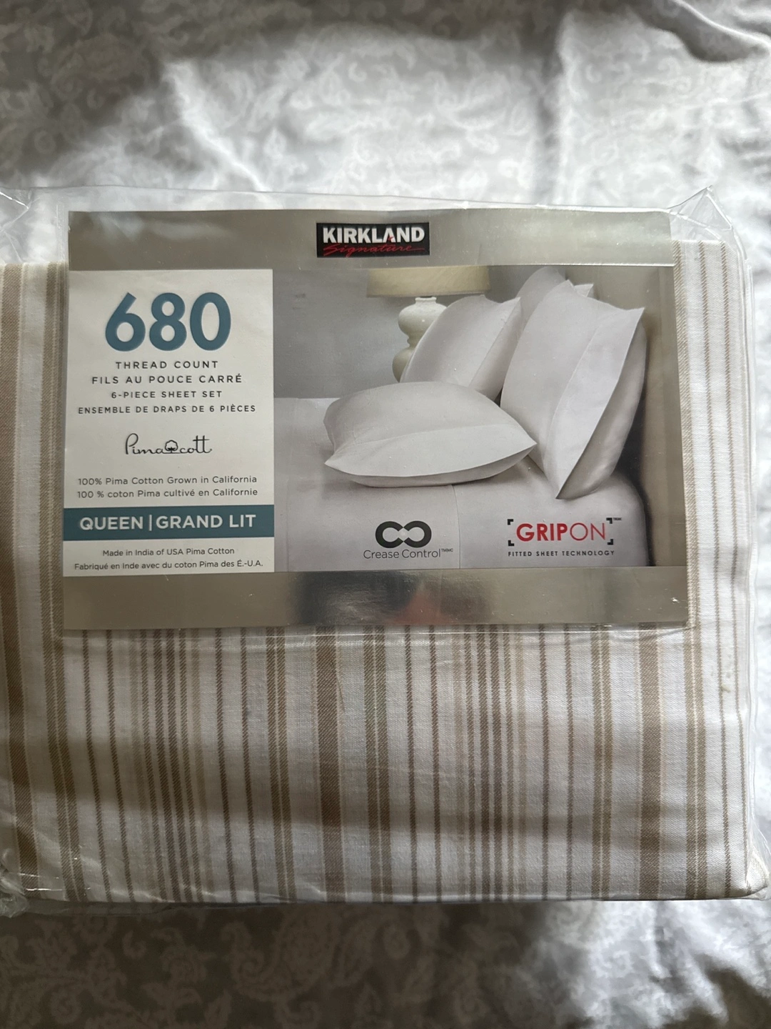 Selling a brand new Kirkland Signature 2-piece sheet set! This set is a Queen size and features a 680 thread count. Made with 100% Pima Cotton grown in California. It also has Crease Control technology and a GripOn fitted sheet technology