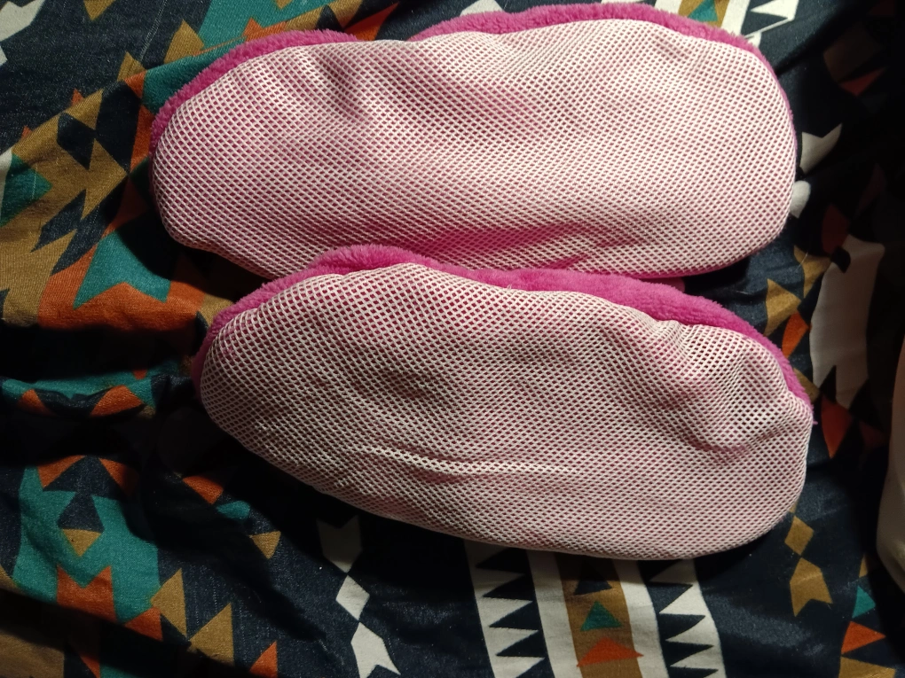 Here are some cute pink slippers! They look super comfy and cozy, perfect for padding around the house. They have a soft, plush interior and a mesh exterior. They have a little bow on each slipper.