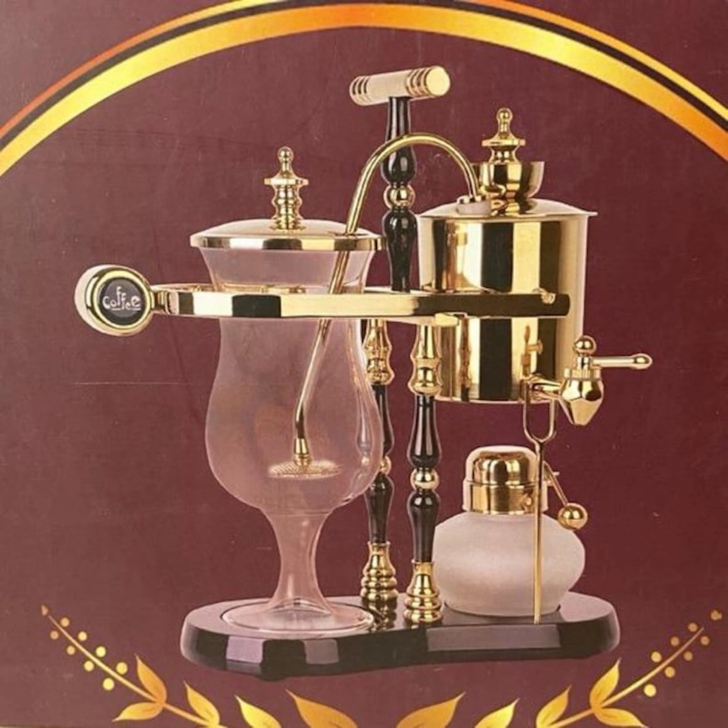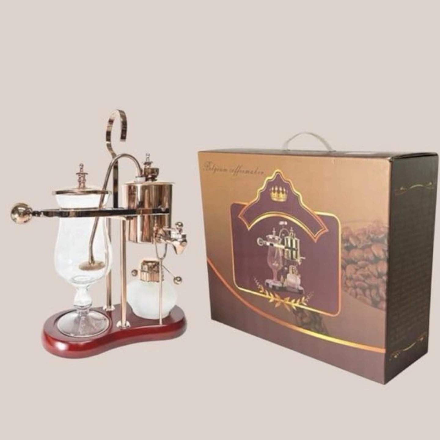 This vintage Belgian coffee maker pot is a collectible kitchen appliance that allows you to make Belgian coffee using high borosilicate glass and 304 stainless steel materials. It has a manual stove type compatibility, a gold color finish, and includes components such as a stent, alcohol lamp, measuring cup, coffee spoon, water container, siphon tube, and glass cup. The coffee maker has a capacity of 15 oz and stands at 14.96 inches tall with a width of 4.7 inches, making it a unique and stylish addition to any home coffee lover's collection.