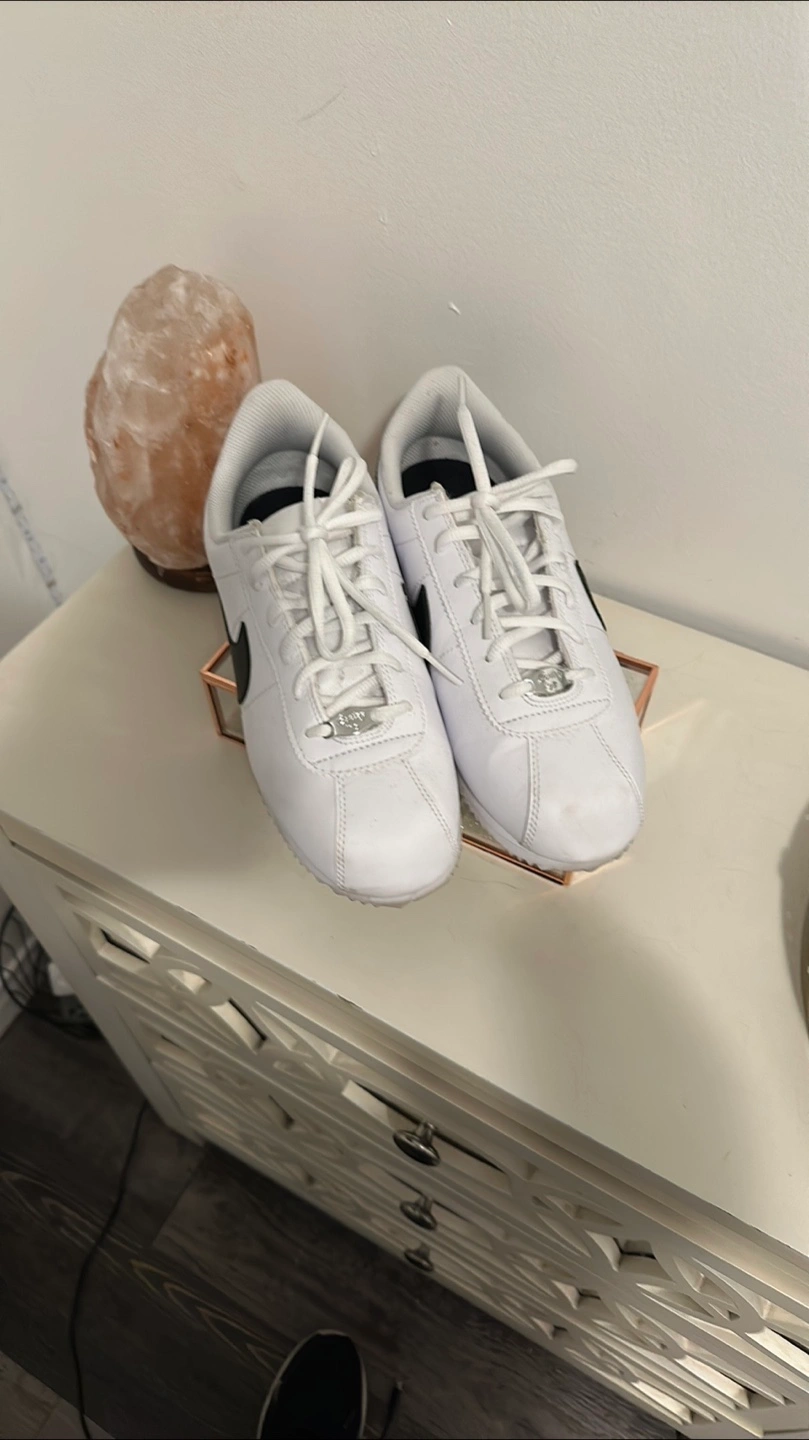 Selling a pair of Nike Cortez sneakers in white with black accents! They're in good condition and ready for a new home.