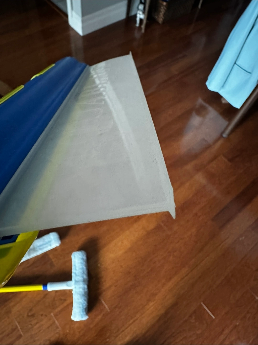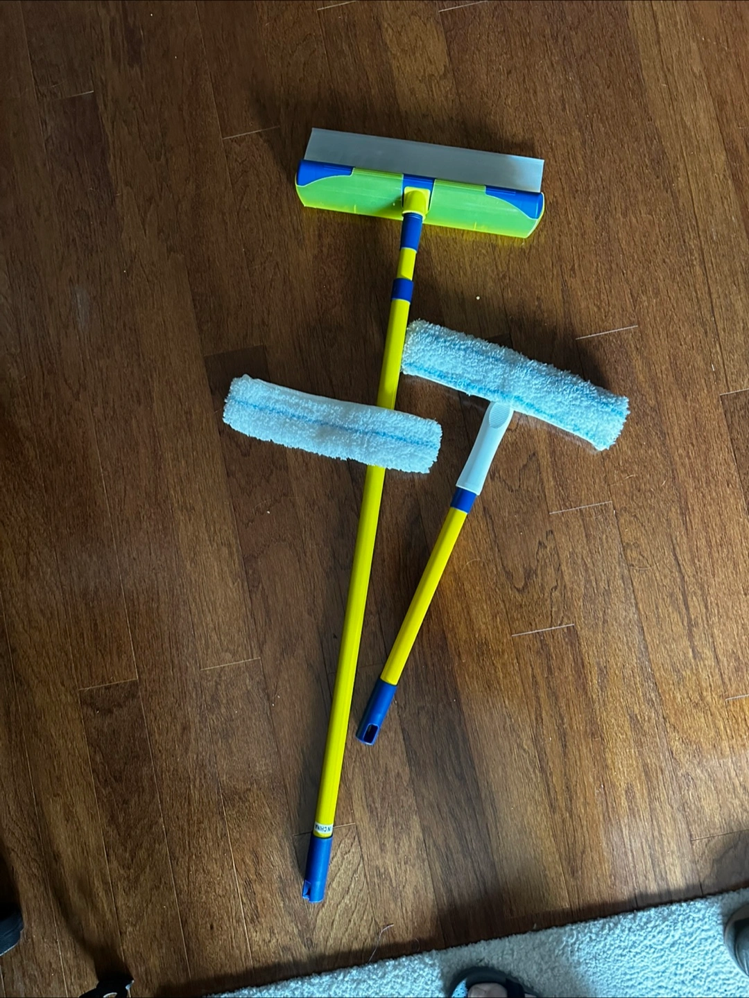 Includes large silicon blade with drip tray, short handle, extension pole, 2 microfibre soft cleaning cloths with Velcro attachment. Cash only.