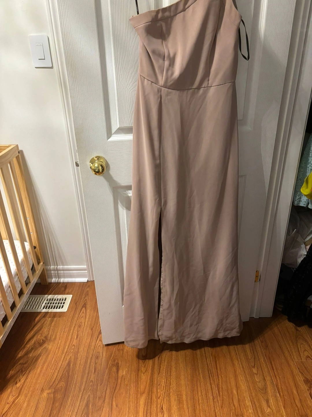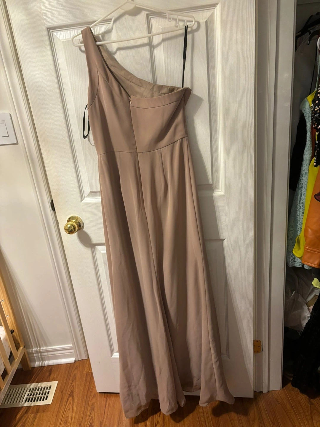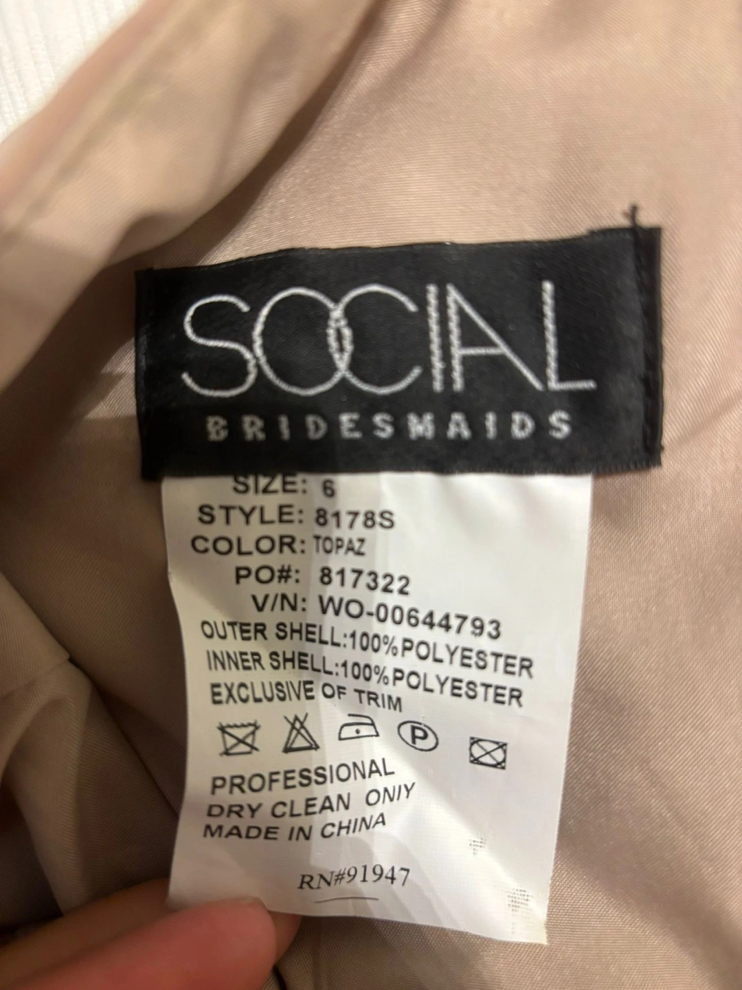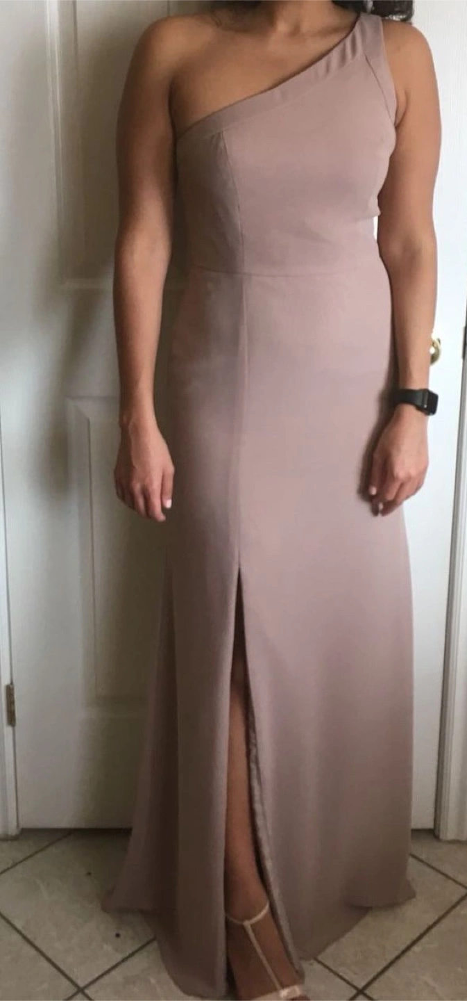 Selling a Social Bridesmaids dress in size 6. The dress is a beautiful topaz colour and features a stylish one-shoulder design with a slit. It's made of 100% polyester, so it's easy to care for and comfortable to wear!