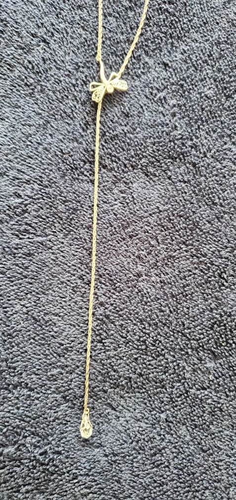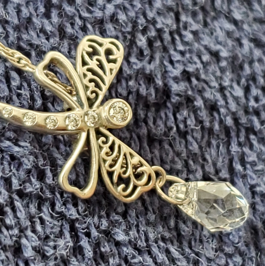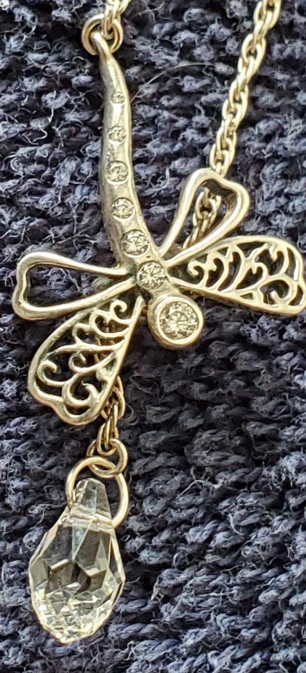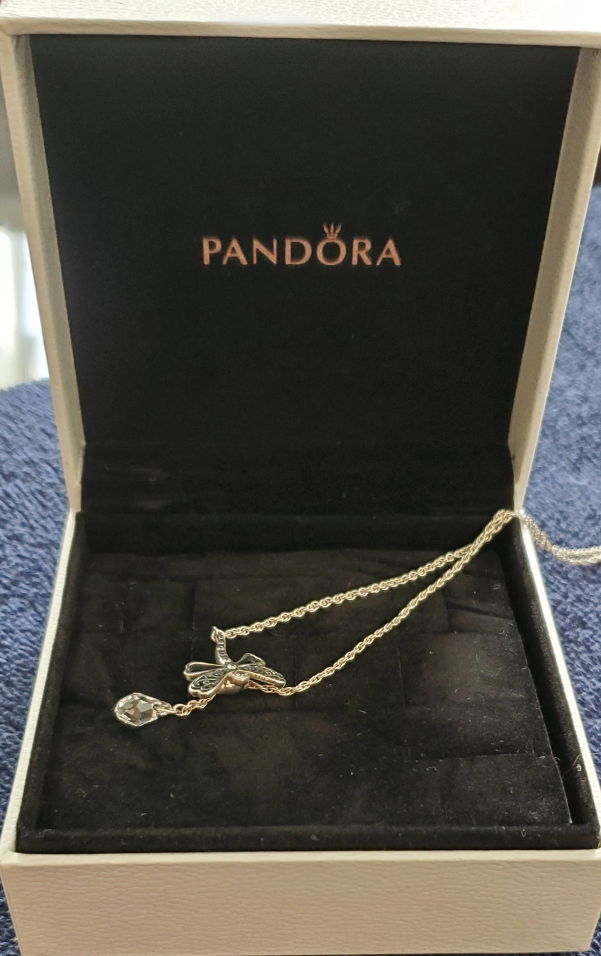 This is a lovely Pandora dragonfly pendant necklace! It comes with its original box, making it a perfect gift or a special treat for yourself. The pendant features a beautiful dragonfly design with intricate details and a sparkling crystal accent. Dragonflies in jewelry are often seen as symbols of change, transformation, adaptability, prosperity, good luck, strength, and agility.