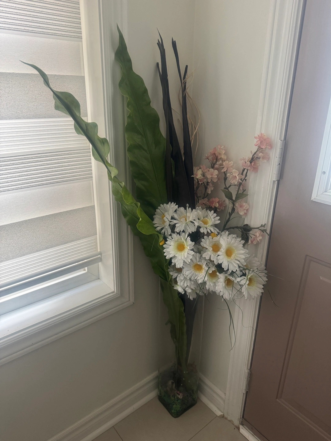 I'm selling a lovely artificial floral arrangement in a vase , leaves were bought from home sense, Vase included.