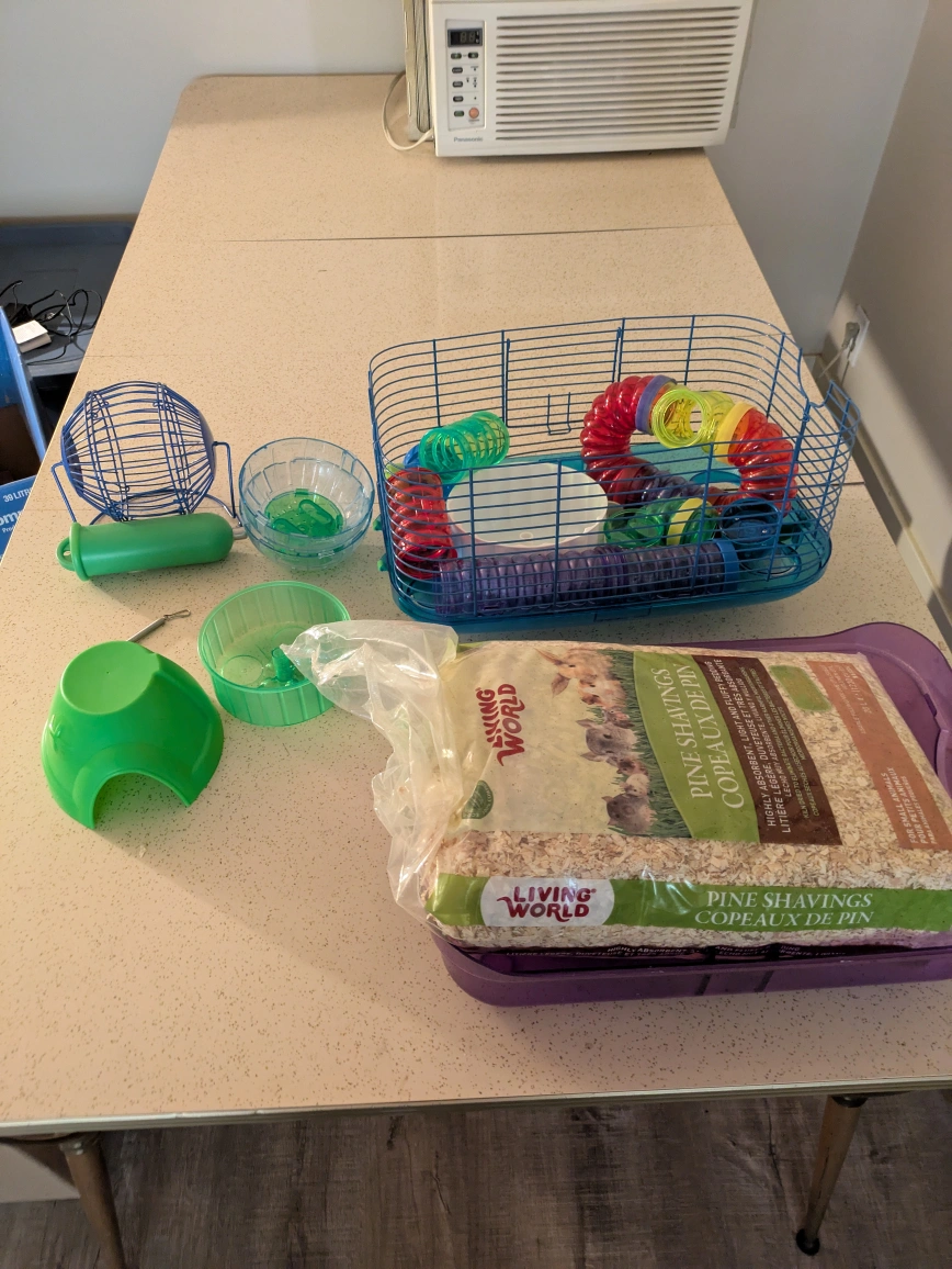 This small animal cage comes with a variety of accessories to keep your furry friend happy and entertained! The set includes a wire cage with a plastic base, perfect for hamsters, gerbils, or mice. I'm also including various toys, like exercise wheels and tunnels, plus a fresh bag of pine shavings for bedding. This used cage and accessories are in great condition and ready for a new home!