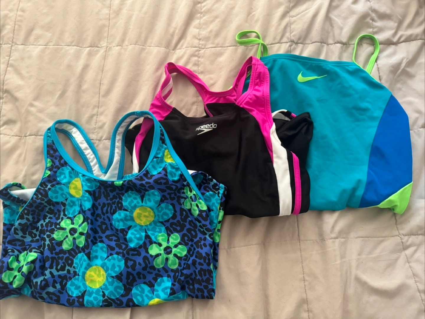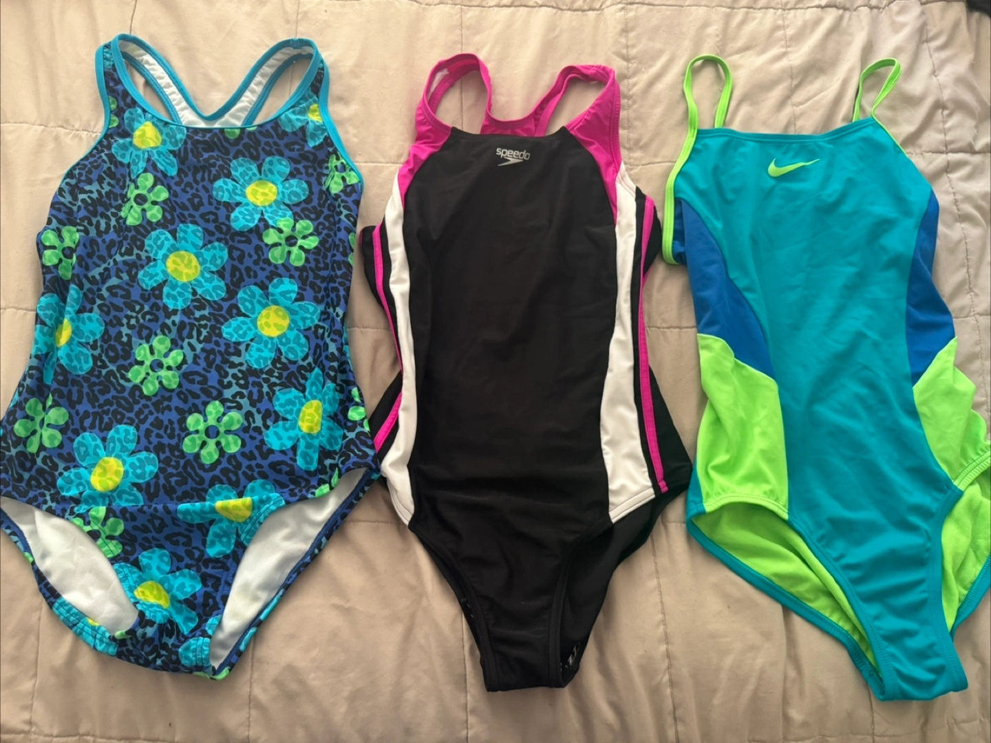 Selling a bundle of three girls' teenagers swimsuits! There's a floral Speedo swimsuit, a black and pink Speedo swimsuit, and a blue and green Nike swimsuit. Great for swimming lessons or a day at the beach!