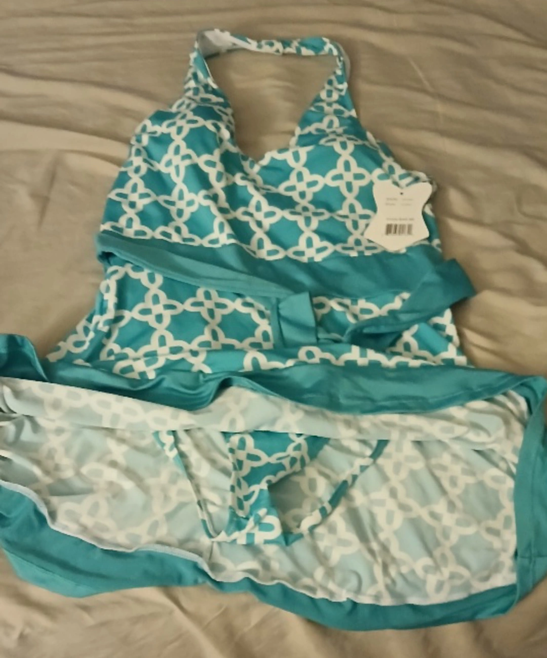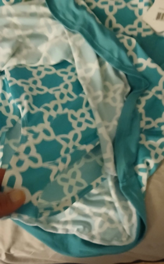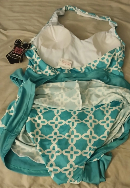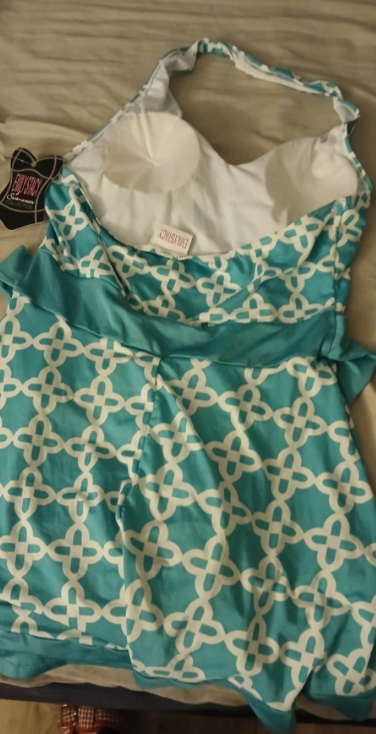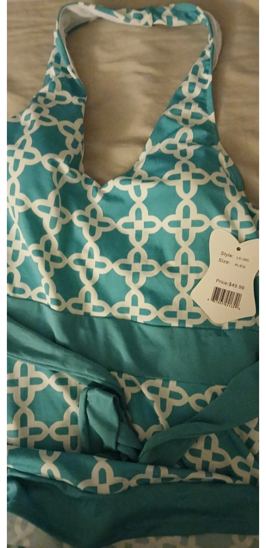 This is an Emily Stacy swimsuit dress in size XL. It's a beautiful aqua color with a white pattern. The style number is LD-58C. fits more like a medium large never used.