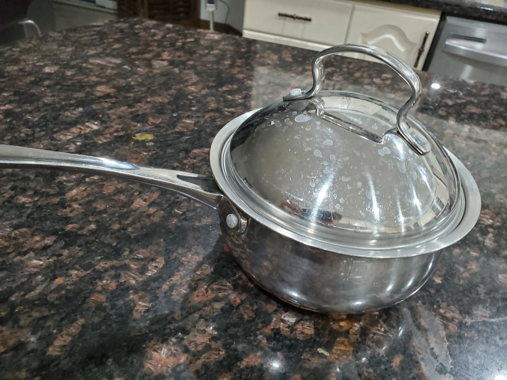 Selling a Professional Home saucepan in great condition! It's a 1.5 quart (1.4 liter) saucepan with a lid. It's made of stainless steel and ready for your kitchen!