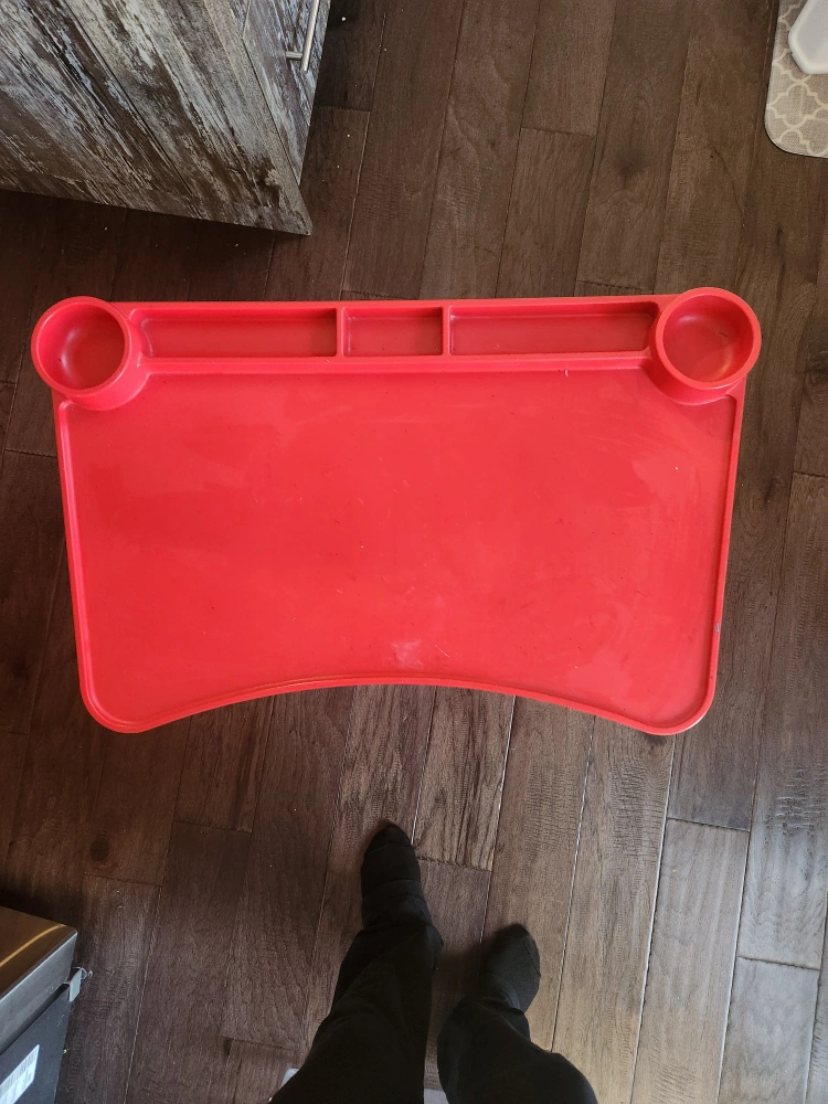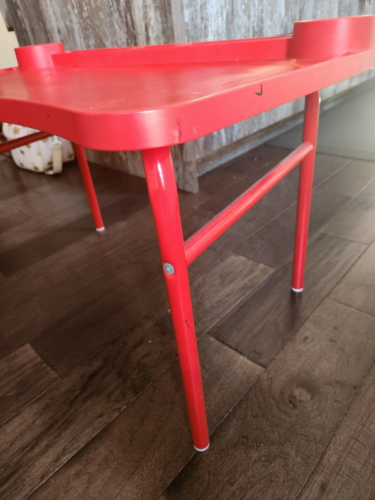 Selling a red metal desk for kids. It's in great shape and perfect for homework, crafts, or snack time! It features built-in storage compartments and cup holders.