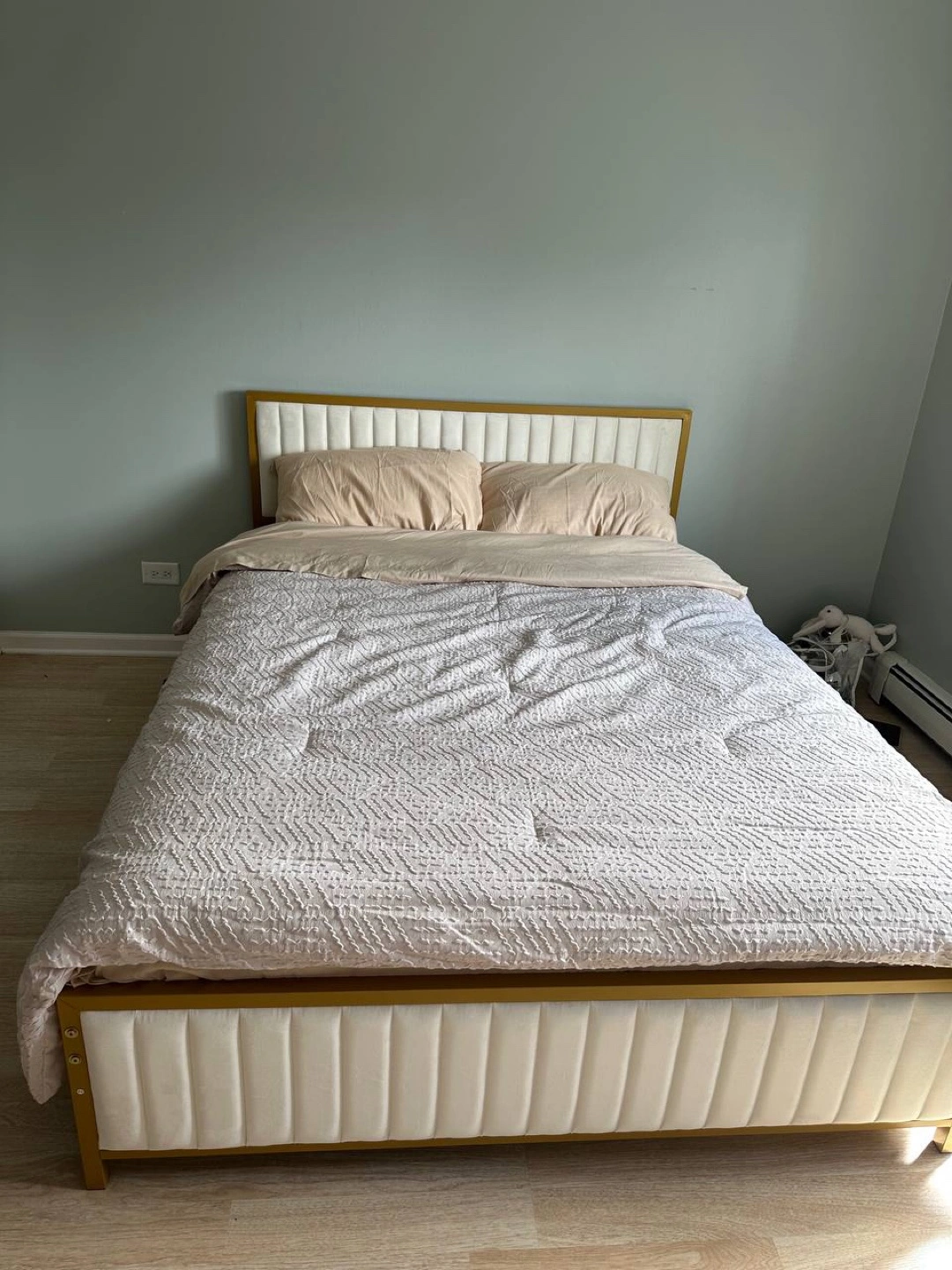 Selling a stylish upholstered platform bed frame! It features a clean, modern design with a white upholstered headboard and gold accents. Perfect for adding a touch of elegance to your bedroom
