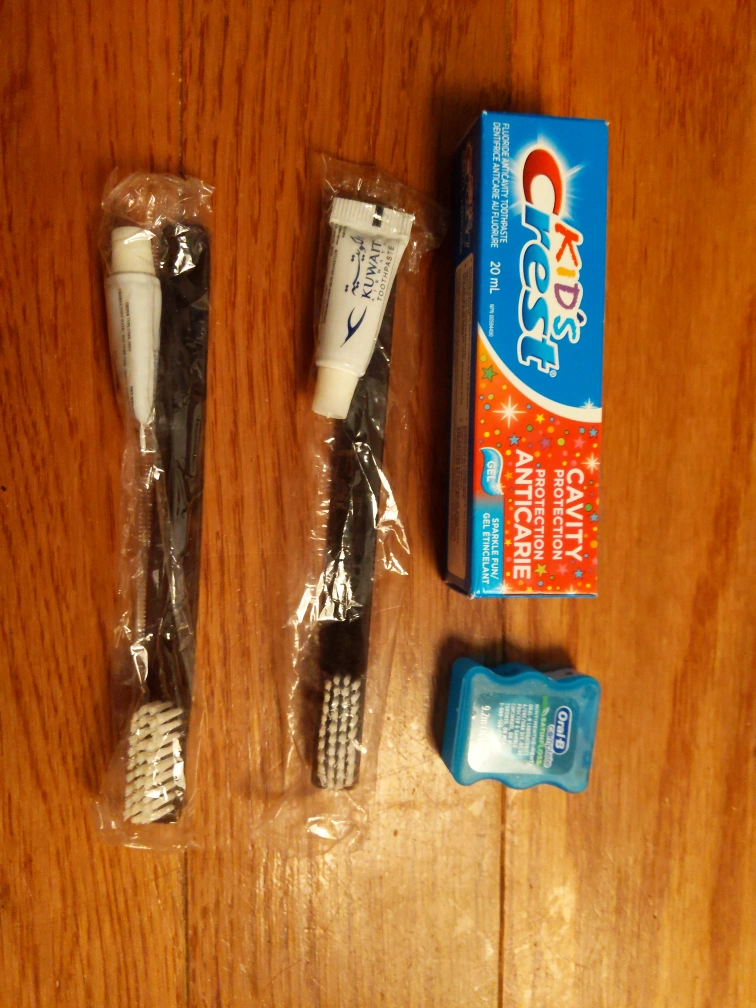Crest Kid's Anticavity Fluoride Toothpaste (20 mL) for cavity protection,two toothbrushes and an Oral-B floss (9.2m). Perfect for keeping those little teeth clean and healthy on flights.