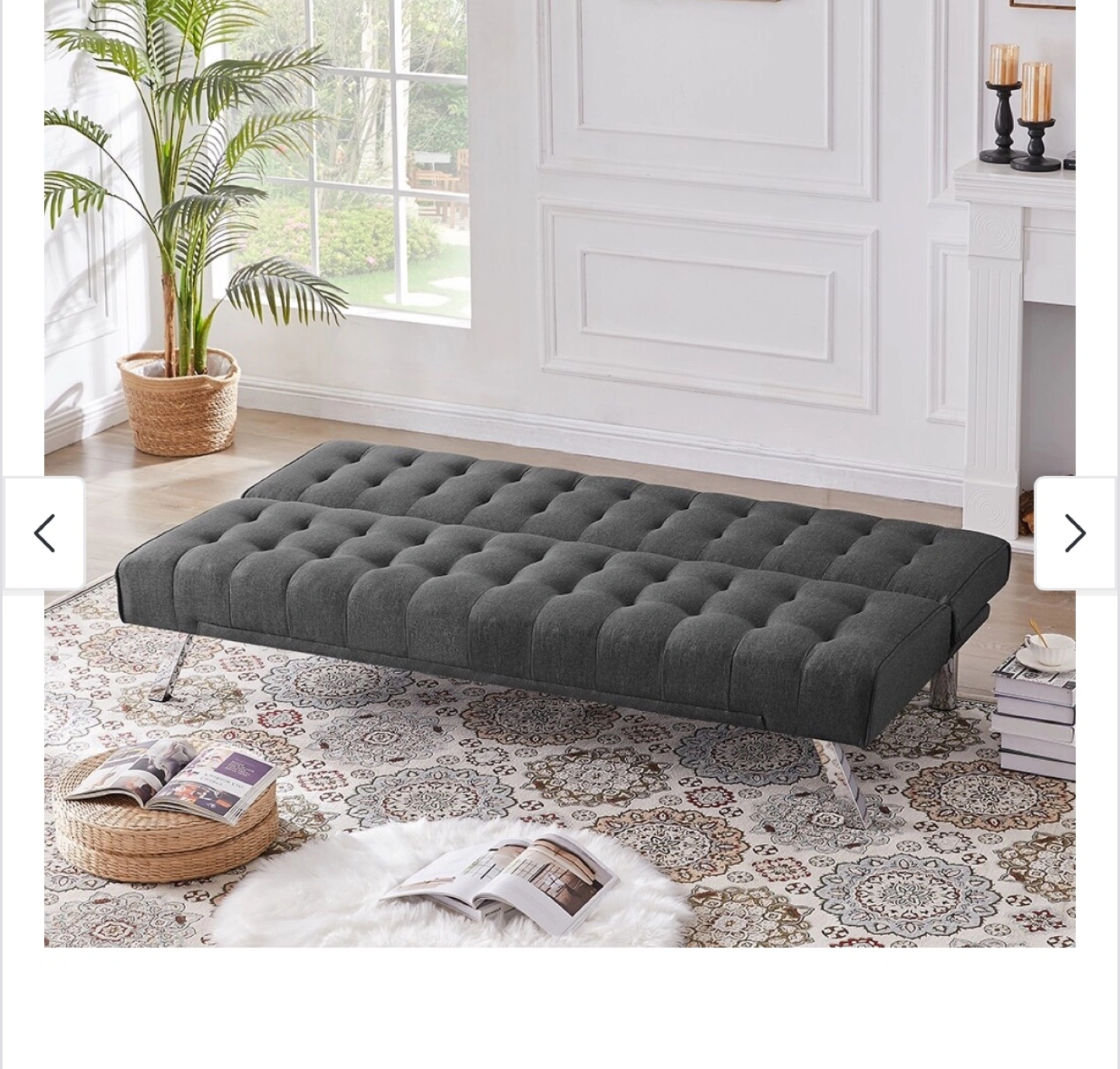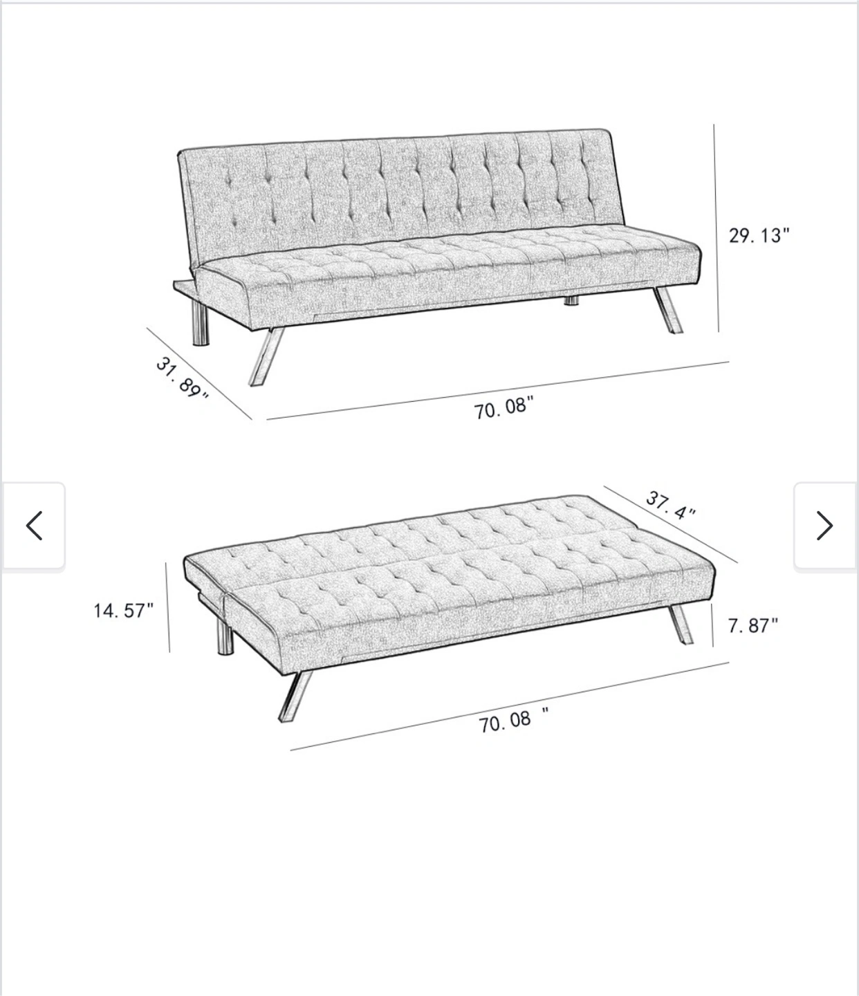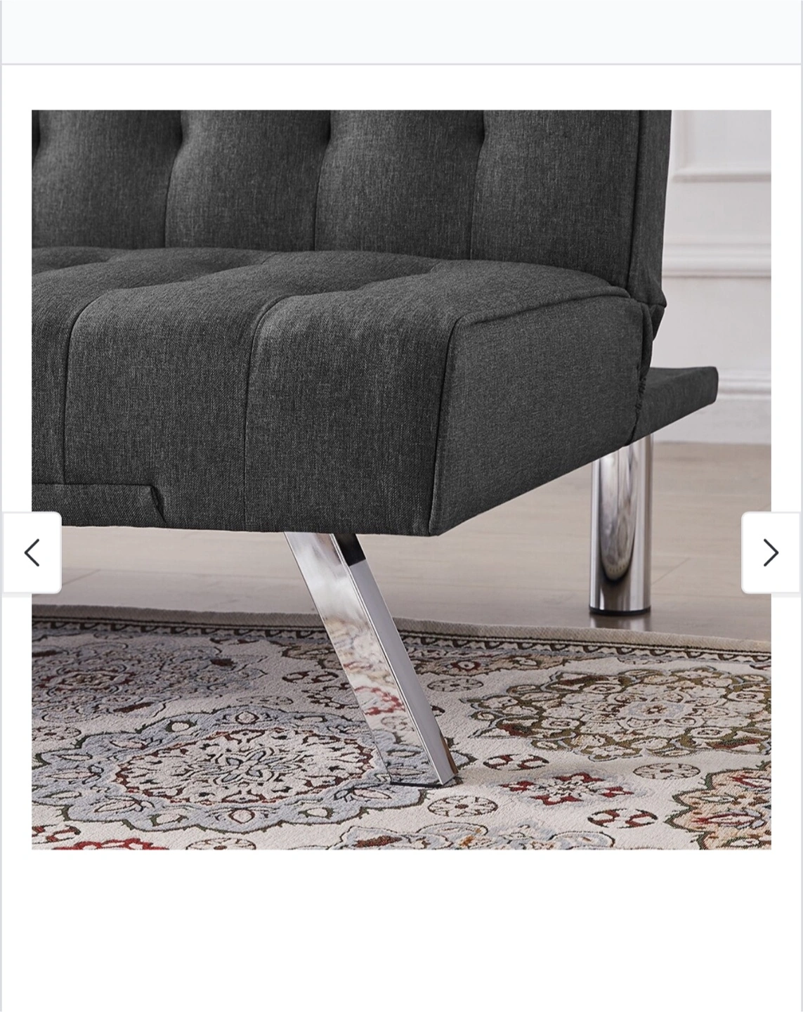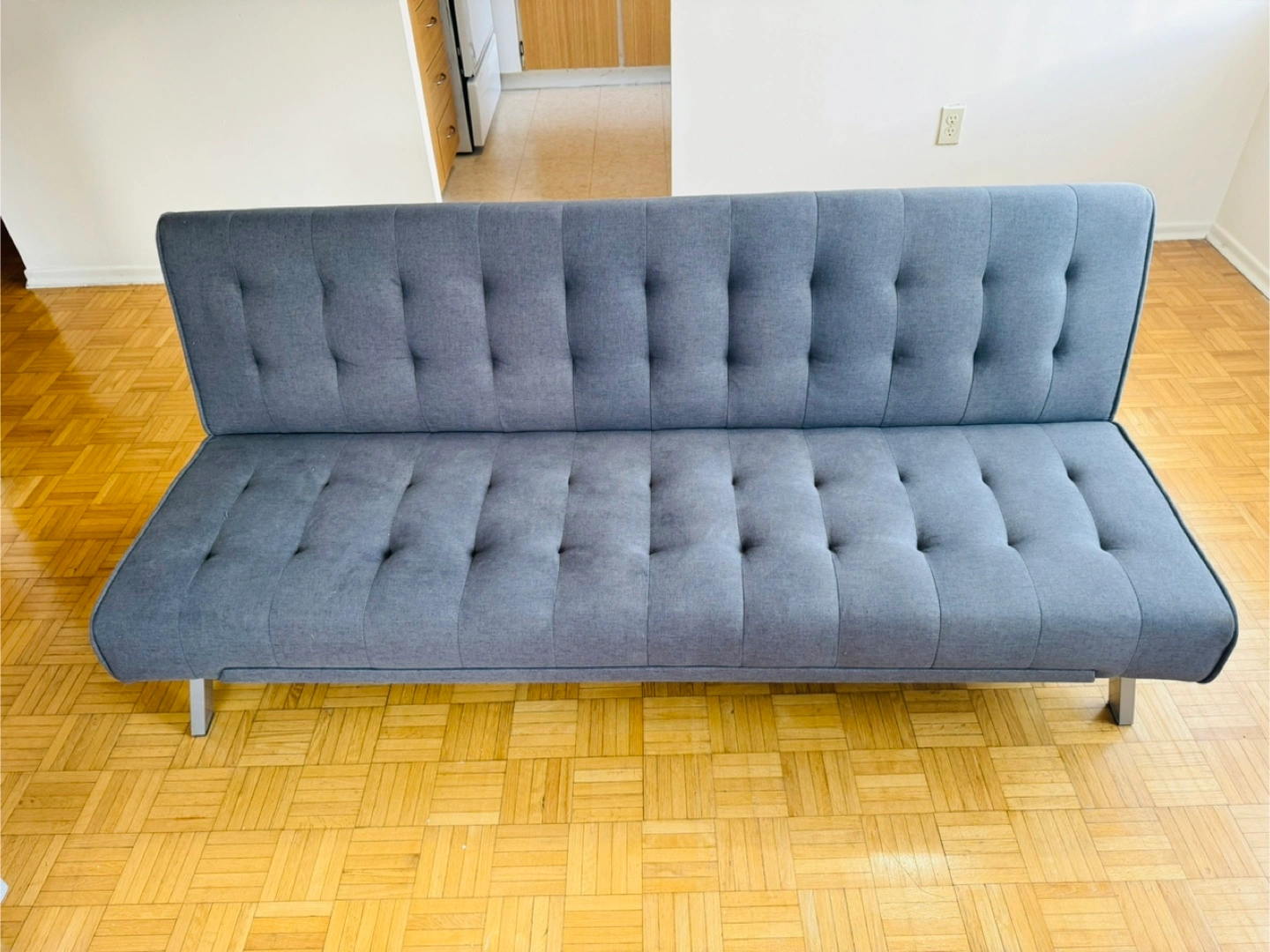 Selling a comfy grey tufted futon sofa bed! It's in great shape and perfect for small spaces or a guest room. The futon easily converts into a bed, making it super versatile. The chrome legs add a modern touch to any room