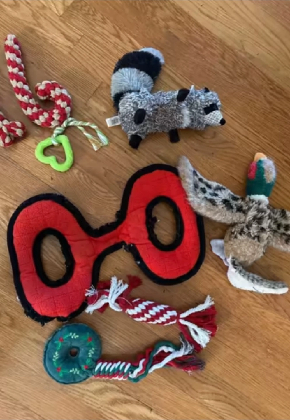 Selling a lot of assorted dog toys! Includes a plush raccoon, a duck toy, a red figure-eight tug, and a few rope toys. They're in good condition and ready for a new home!