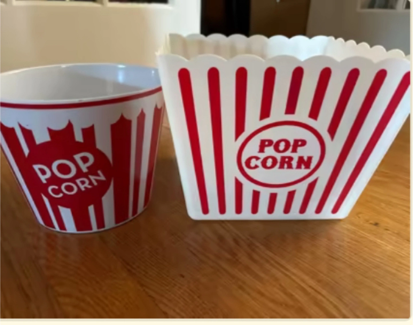 Selling a cute popcorn bowl set! It includes a round bowl and a square container, both with a classic red and white striped design and 'POP CORN' printed on them. Perfect for movie nights!