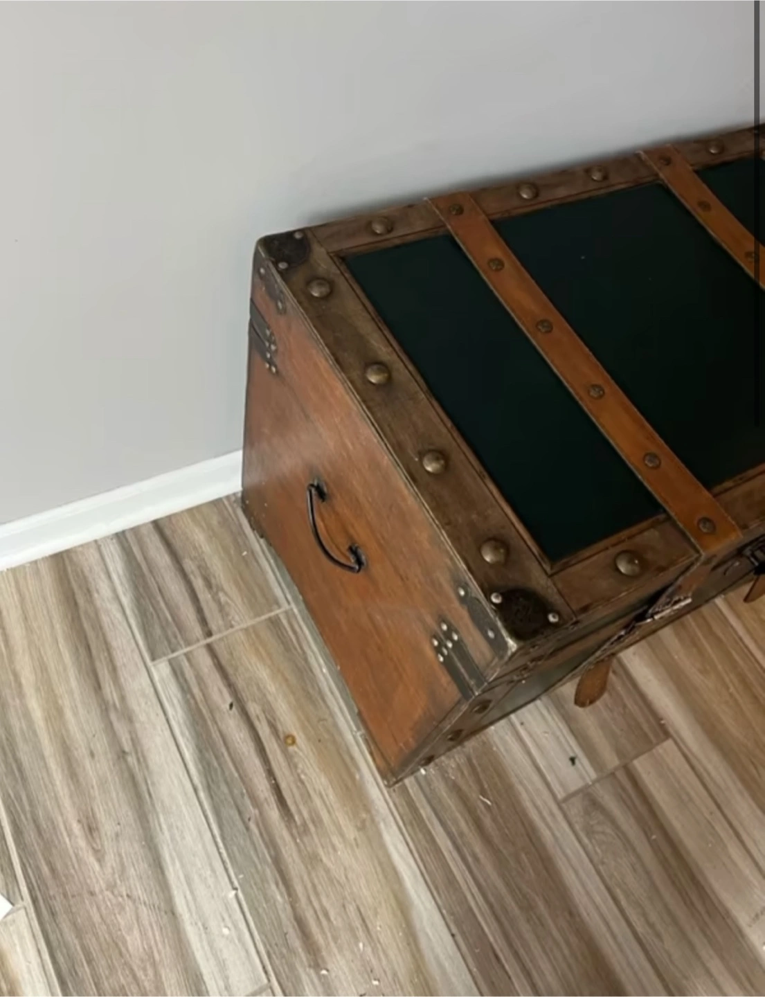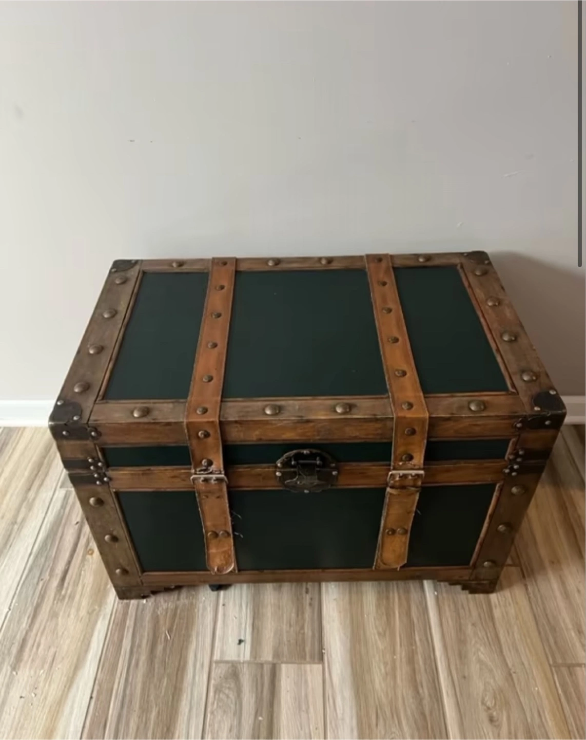 Selling a vintage-style storage trunk! It features a rustic design with wooden accents and faux leather straps. This trunk is perfect for adding a touch of old-world charm to your home while providing ample storage space
